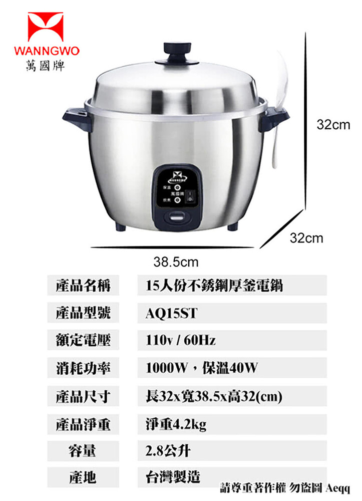 【萬國牌】 15人份不銹鋼厚釜電鍋(AQ15ST)