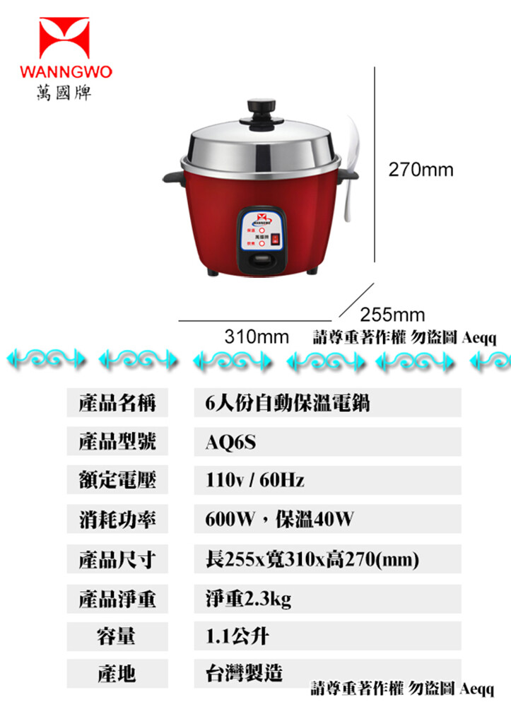 【萬國牌】6人份自動保溫電鍋(AQ6S)