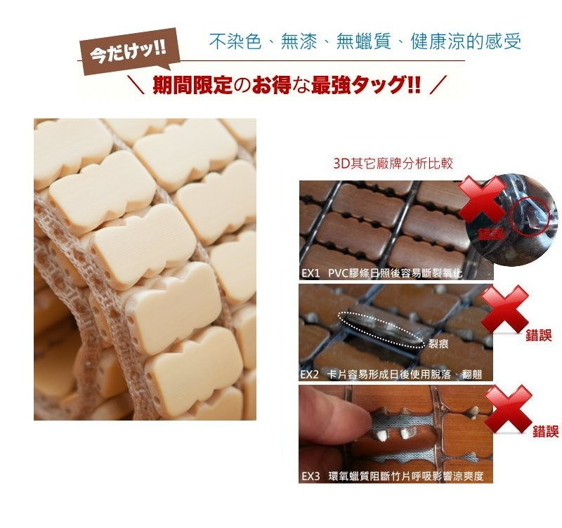 ・採用四年以上孟宗竹中段片 ,足片厚度足0.6公分,透氣排濕效果,