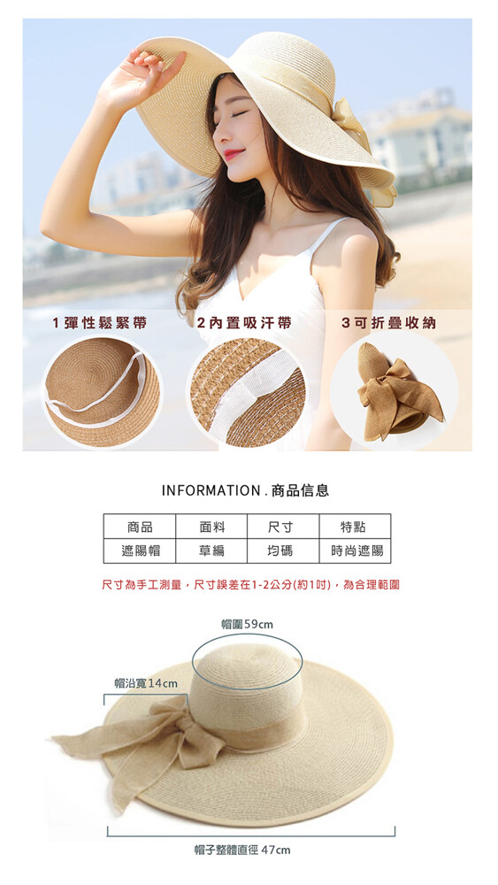 尺寸:頭圍59cm、帽檐14cm、全帽直徑47cm