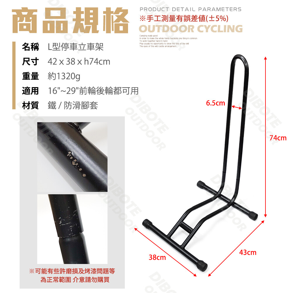 ◆直接將輪子插入即可停車 簡單方便 小孩也會 ◆加粗鐵管 堅固耐用 ◆16~29吋自行車都可停(輪胎厚度6cm內) ◆安裝簡單 一步完成 ===商品規格=== 名稱:L型停車立車架 尺寸:42x38xh74cm 重量:約1320g 材質:鐵管/防滑腳套