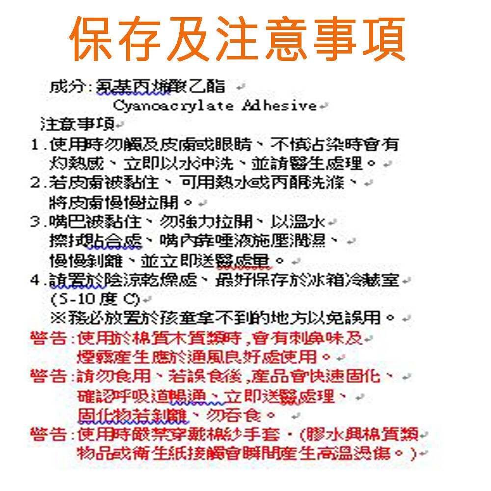 被黏物要清潔,乾燥,不可有油垢,在以膠水塗於被黏物的一面立即施壓約30秒~60秒(或用夾子)後,就可牢固黏合物~