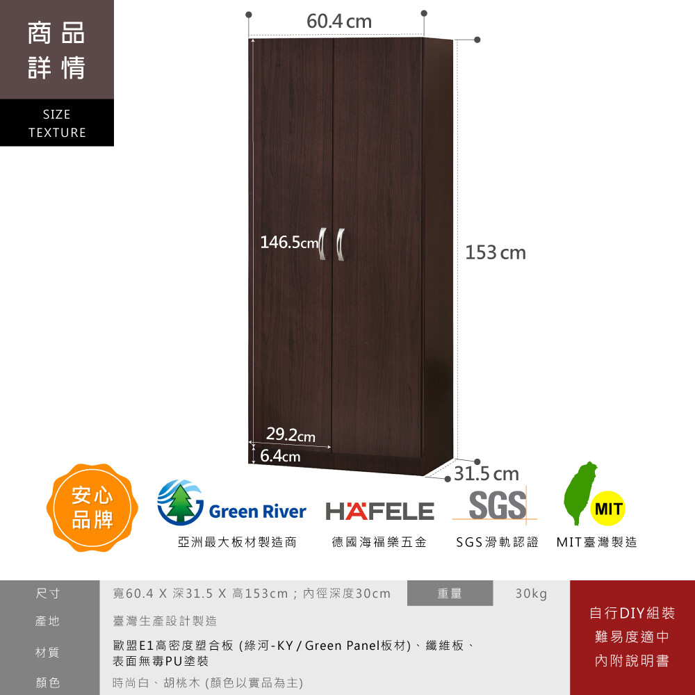 ◎尺寸:寬60.4 X 深31.5 X 高153 cm;內徑深度30cm