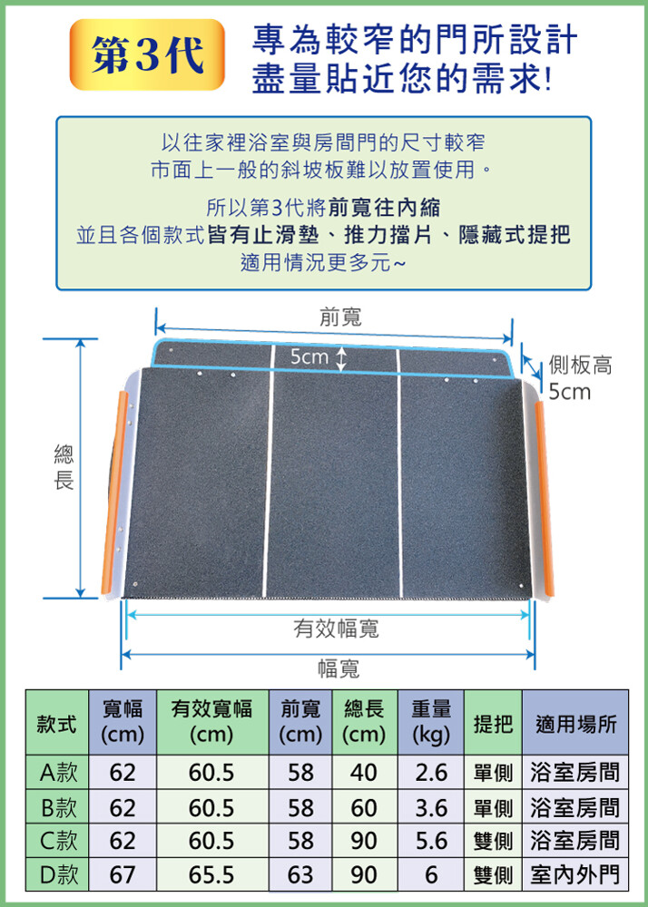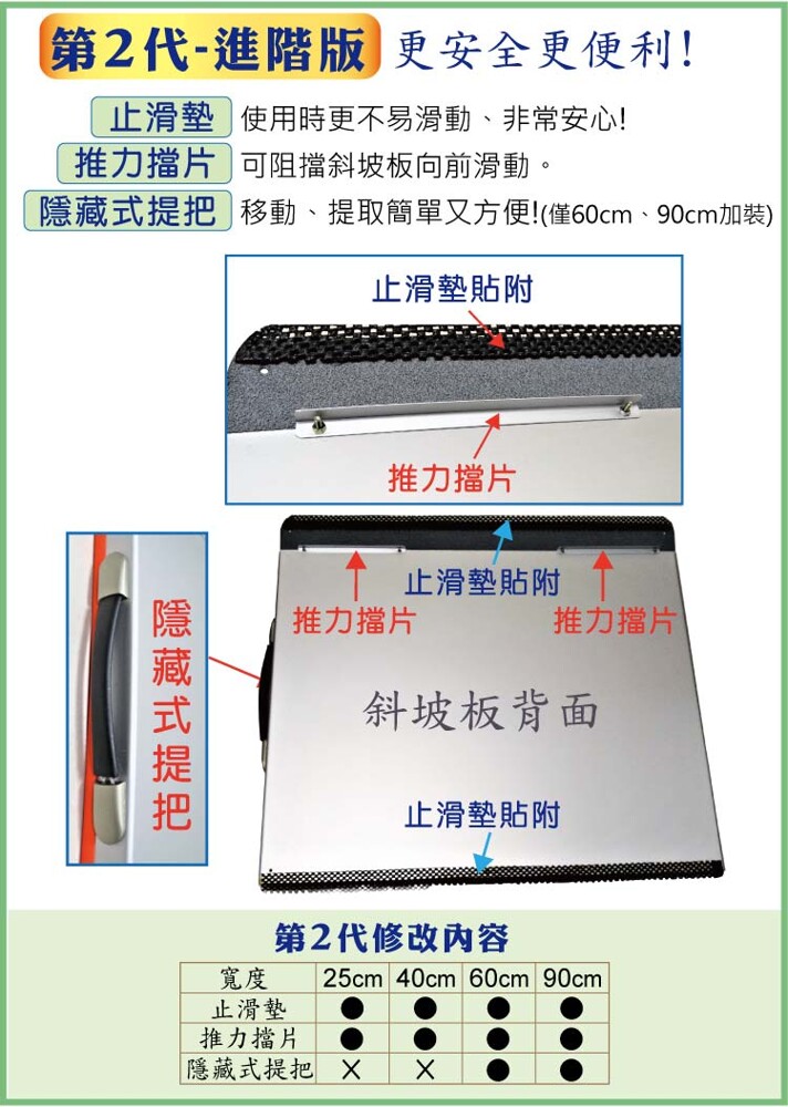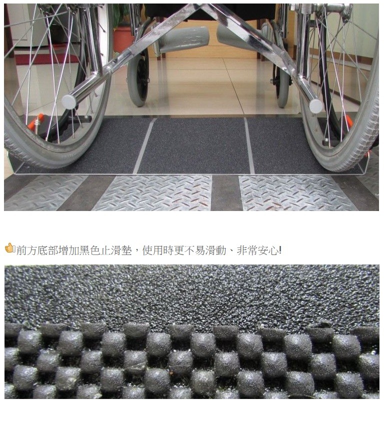 台灣製/外銷日本款 附防掉落側板、防刮傷膠條, 止滑加工、推力擋板,安全升級!! 可直接放置使用,也可鎖上固定 ★☆★非固定式斜坡板A款- 如需申請居家無障礙設施補助之保固書,請在下訂後於備註欄註明或來電告知我們唷~★☆★