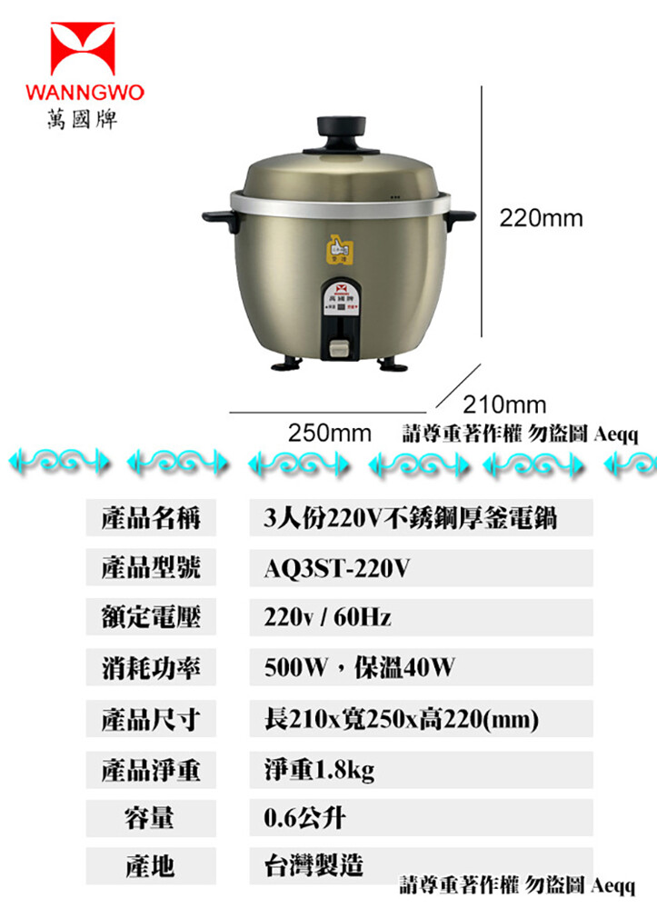 【萬國牌】3人份不銹鋼厚釜電鍋220V(AQ3ST)