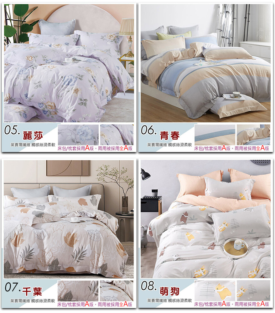 商品組合:6尺加大床包 x1入、信封式薄枕套 x2個、雙人鋪棉兩用被x1件 共四件/組。