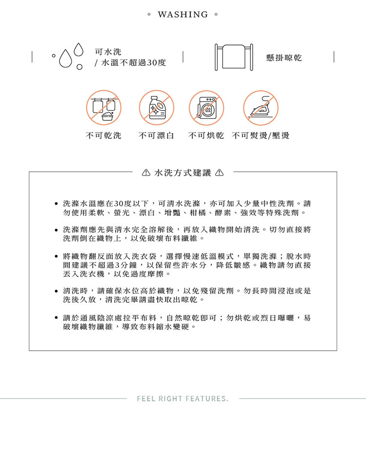 ◉清潔保養方式:可水洗(水溫不可超過攝氏40度)/可乾洗/不可烘乾/不可漂白/需隔布熨燙,且溫度低於110度