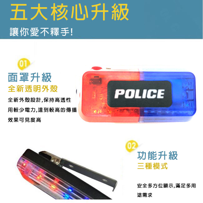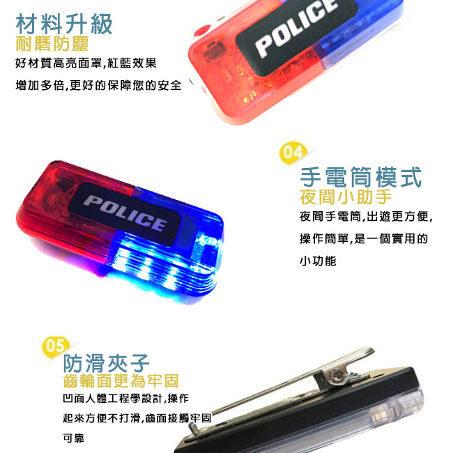 ●交替閃爍(慢速)、交替閃爍(快速)、LED手電筒、三種模式切換