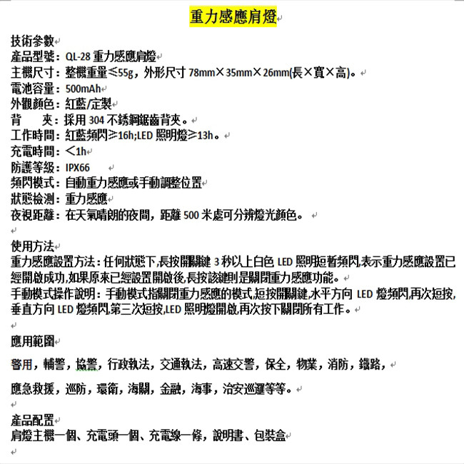 ■附件:肩燈*1 + 充電器*1 + 說明書*1
