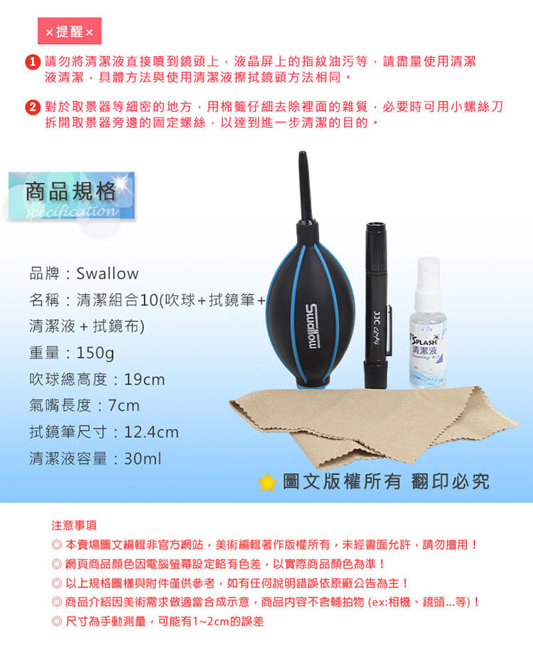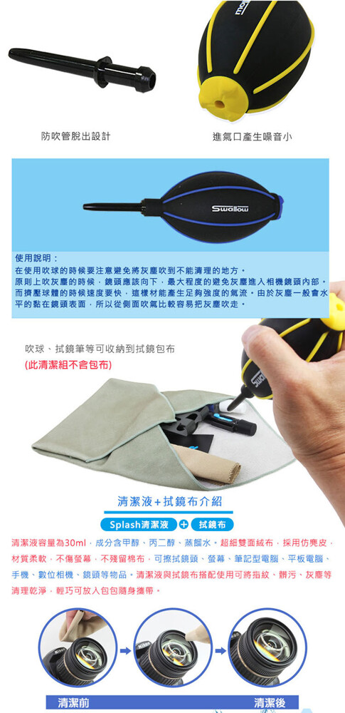 名稱:清潔組合10(吹球+拭鏡筆+清潔液+拭鏡布)