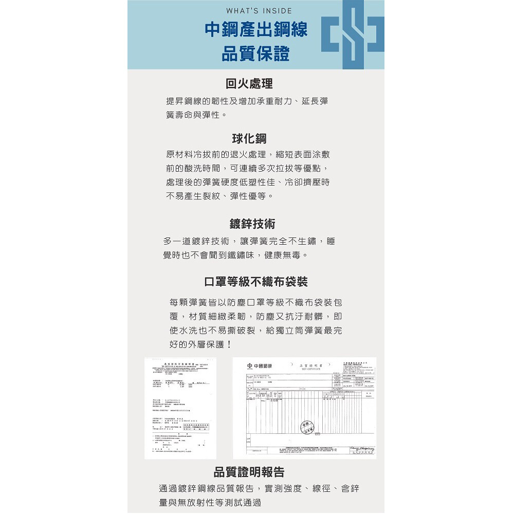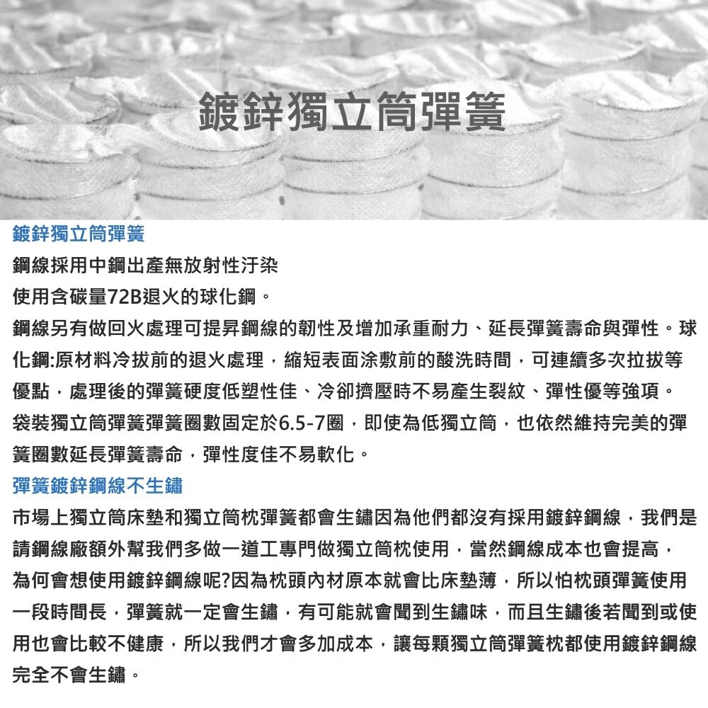 此獨立筒枕頭由台灣生產並取得鋼線原材料無放射性污染證明證書。產品材質主要採用4D透氣網布,透氣舒爽、舒適耐用。傳統枕頭材質多為棉花和人造纖維,透氣性能較差,同時,棉質傳統枕頭容易沾染灰塵、汗漬等污垢,而本產品採用獨有的4D網布具有透氣好、不易納垢等特點,能夠有效改善傳統枕頭存在的問題,為用戶的健康加分,用料的綜合指標普遍優於傳統枕頭。枕芯的獨立筒彈簧採用無放射性污染的鋼線,主要鋼線材質含碳量72B退火的球化鋼,經過回火處理後,大幅提升了鋼線的韌性,其含碳量大幅高於市場上普通彈簧床墊的鋼線碳含量,經過5萬次機器擠壓和汽車碾壓試驗,毫無變形跡象,一改傳統枕頭受壓易變扁,難以恢復原狀的現象。傳統枕頭由於材質缺乏科技性且用料較為單一,多為傳統的自然產品,長時間與頭部接觸,著力點壓力無法釋放,而當獨立筒枕頭內芯受到壓力時,它會慢慢回彈釋放壓力,對使用者的頭部形成一個支撐面,舒緩用戶頭部壓力,使用戶擁有最佳的體驗。獨立筒枕頭所有的關鍵產品均由本廠運用現代最新的科技自產自用,保證產品品質,使本產品在外觀以及使用舒適度上均與市面上傳統枕頭產生很大的區別,全面改善傳統枕頭的固有缺陷,締造科技枕頭,提升用戶體驗,保障用戶健康。