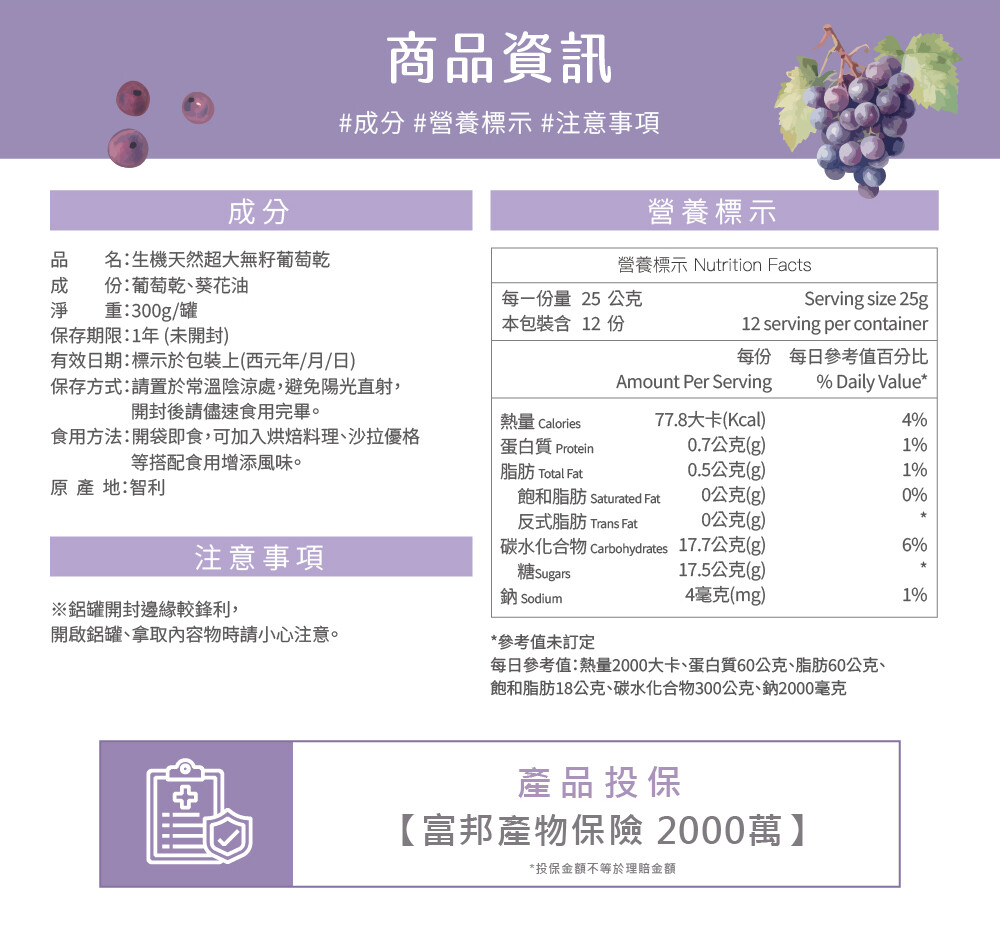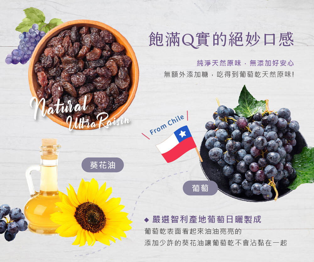 3.商品內容(產地):葡萄乾(智利)、葵花油