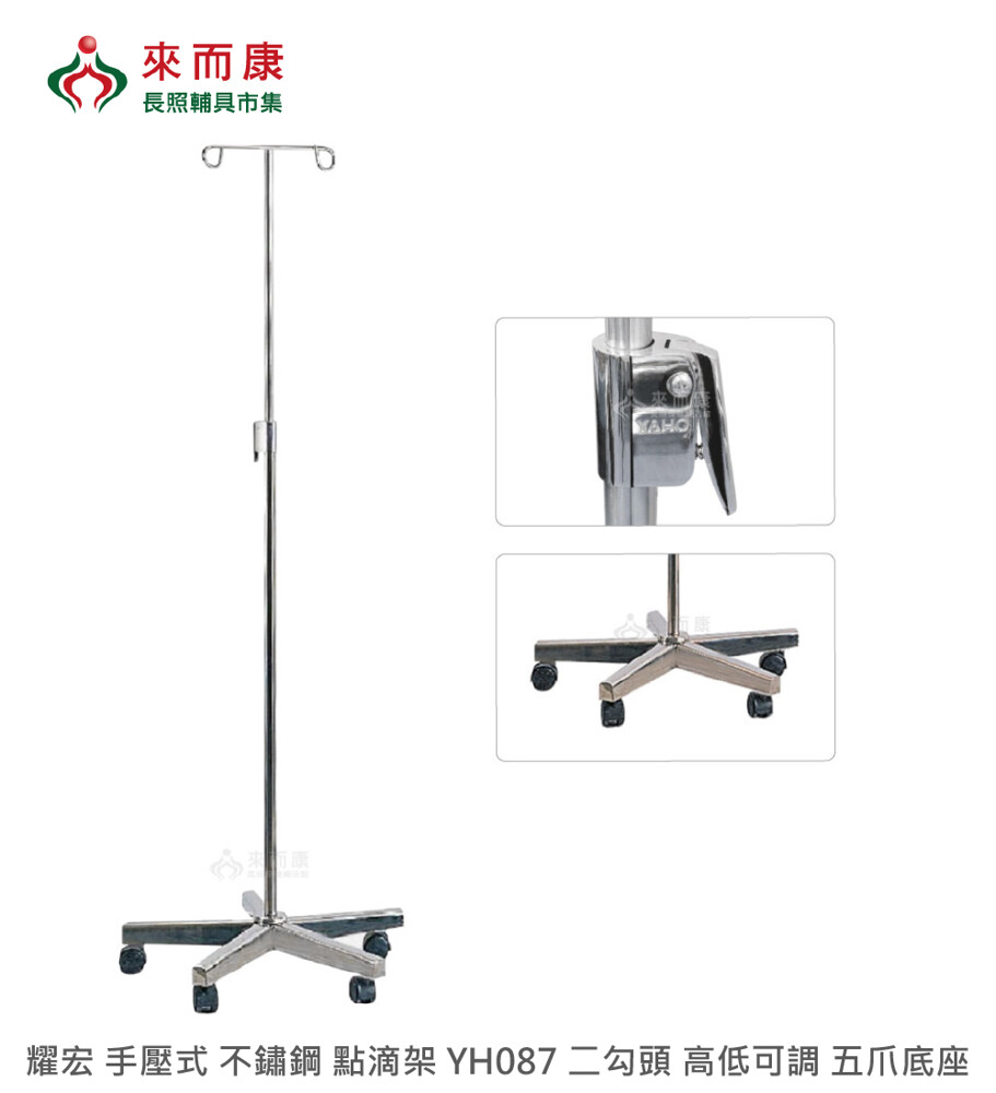 來而康 耀宏 手壓式 不鏽鋼 點滴架 YH087 二勾頭 高低可調 五爪底座 點滴 支架