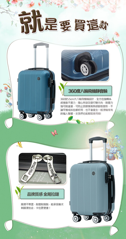 360度5.5公分大八輪加寬設計,全方位旋轉系統推動不費力,隨心所欲改變行駛方向,耐磨力強可耐重量,可防止因摩擦高熱不斷裂變形,不論平推或斜拉都好用,也不會產生一般滑輪常有的惱人聲響。女孩們也能輕鬆使用唷! (18吋是8輪飛機輪)