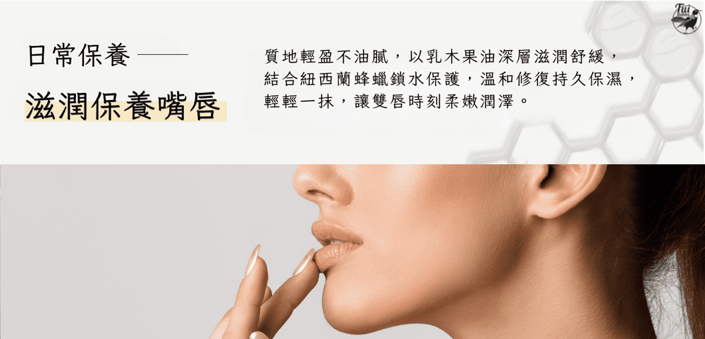 乳木果油、維生素E能長效滋潤保濕雙唇,紐西蘭蜂蠟有效舒緩呵護乾燥與經日曬的雙唇,質地輕盈不油膩,給嘴唇雙重保養,天然植物精油調理,給唇部最純粹的修護: