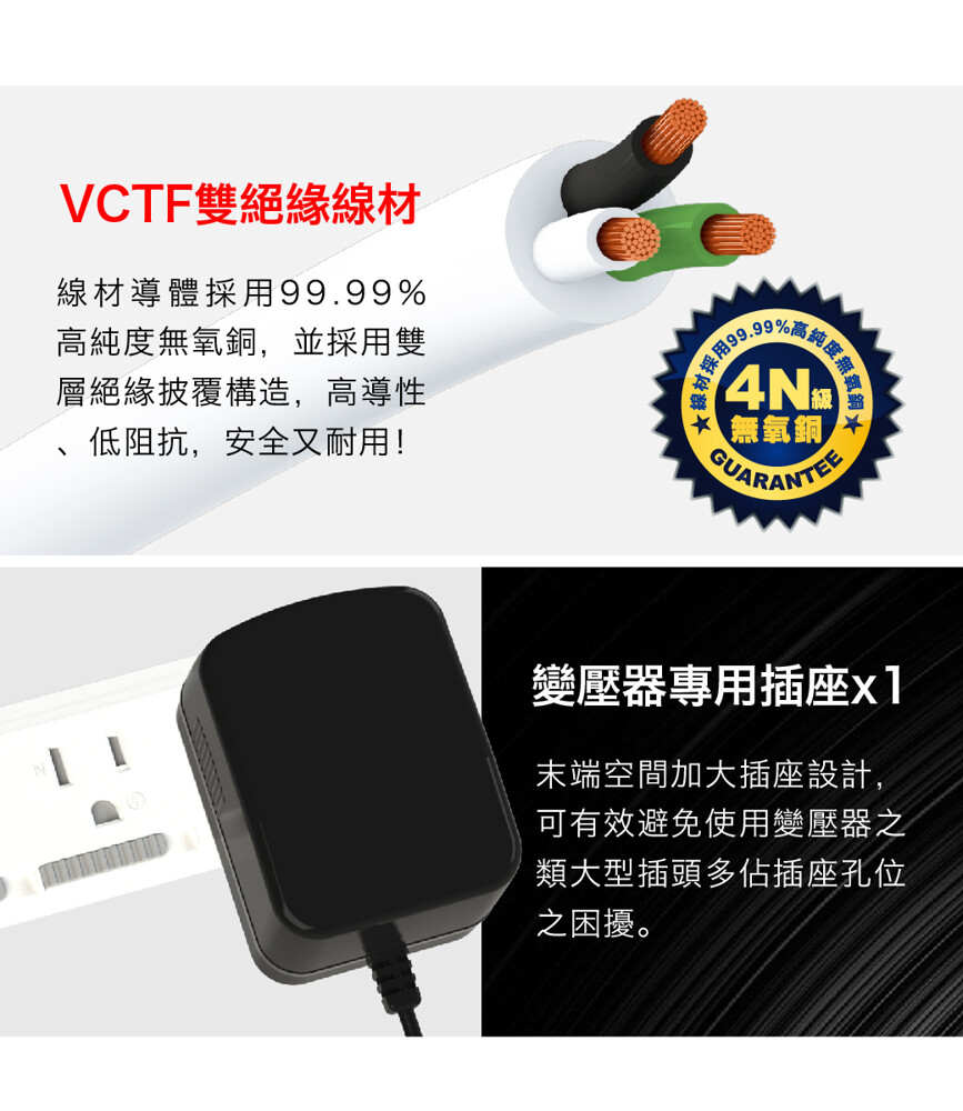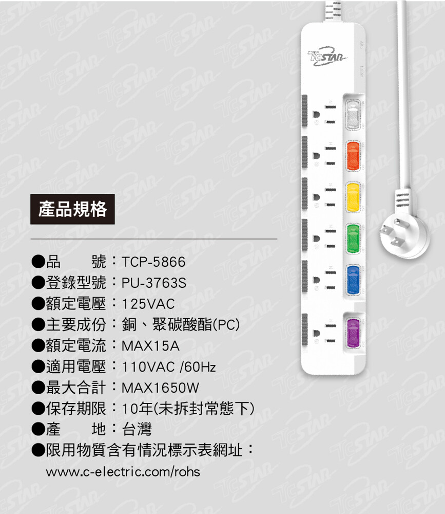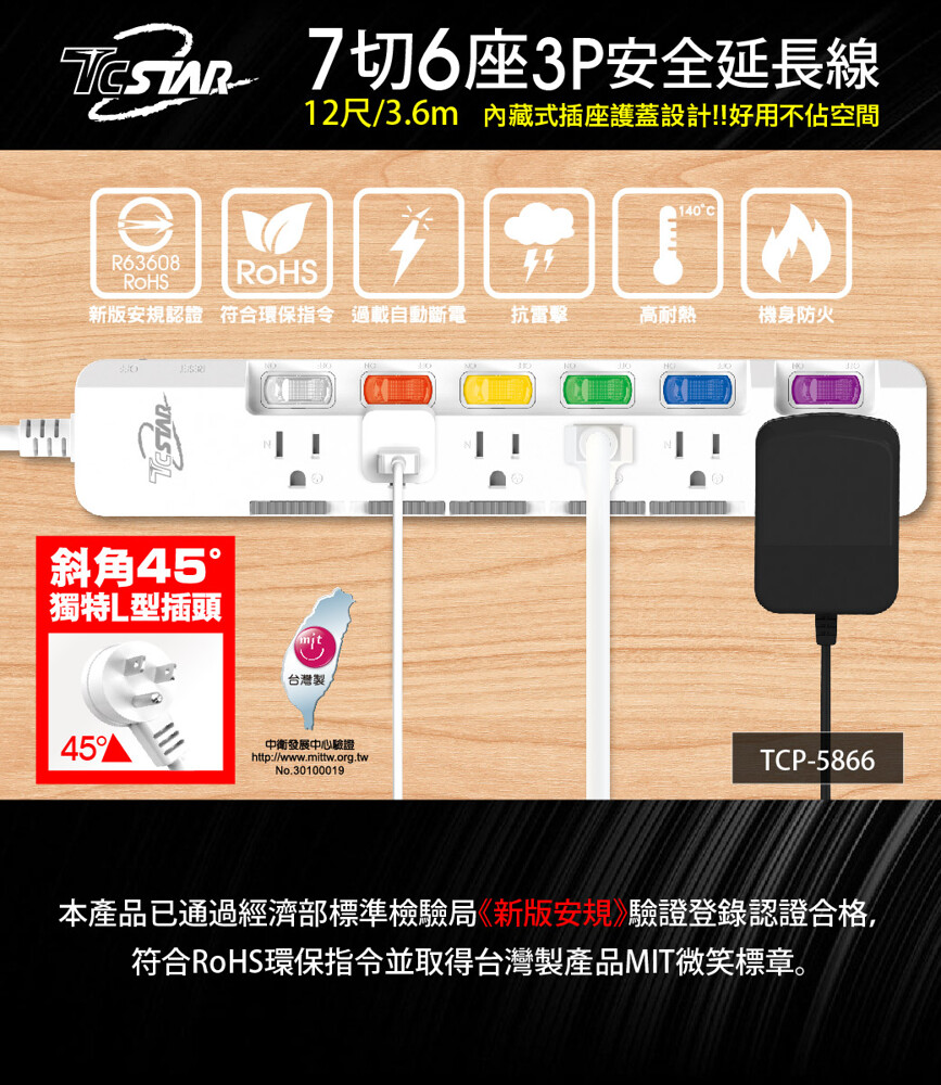 TCSTAR TCP-5866 7切6座 帶護蓋延長線 電源線 電腦延長線 電源延長線 12尺