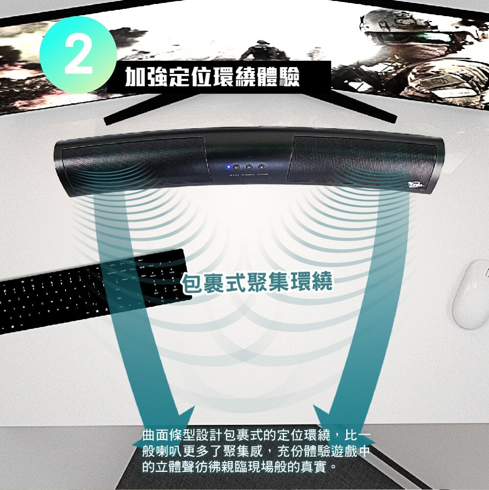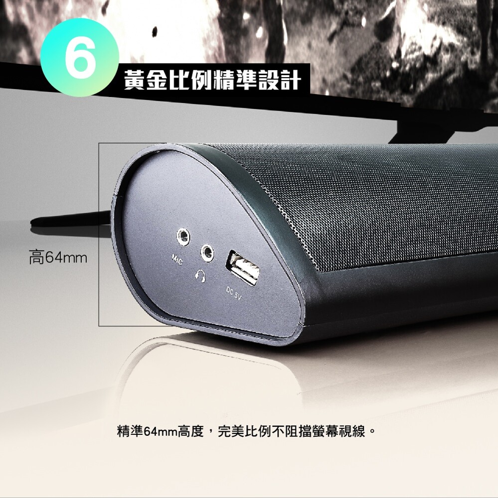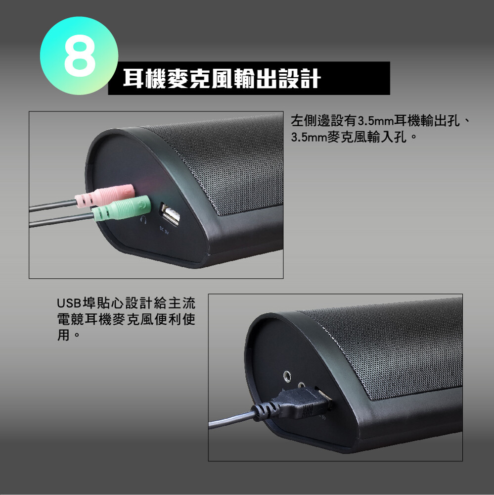 10W真實還原音效 主流電競耳機麥克風(USB輸出)的貼心設計 曲面聲霸設計準確的定位環繞 USB供電設計 蜂巢金屬網狀搭配高壓堅固的ABS設計 喇叭底部設有EVA材質的防滑軟墊 可用於電腦、電視、手機、平板、筆電等影音設備。