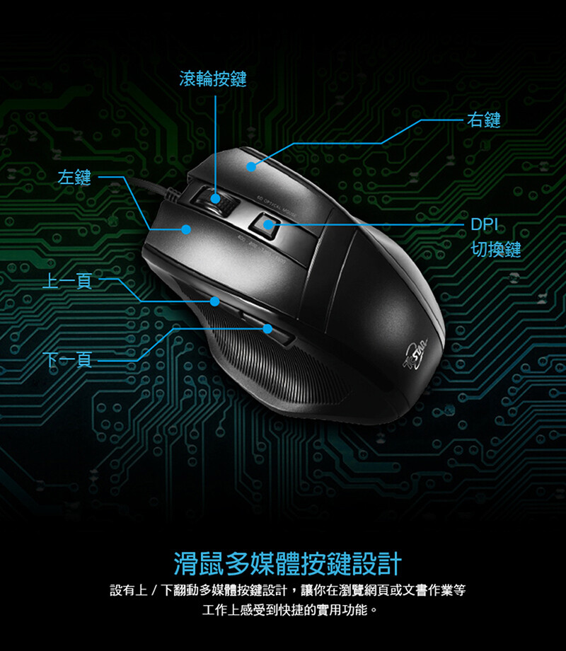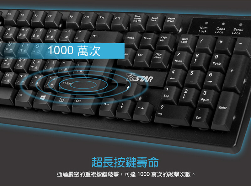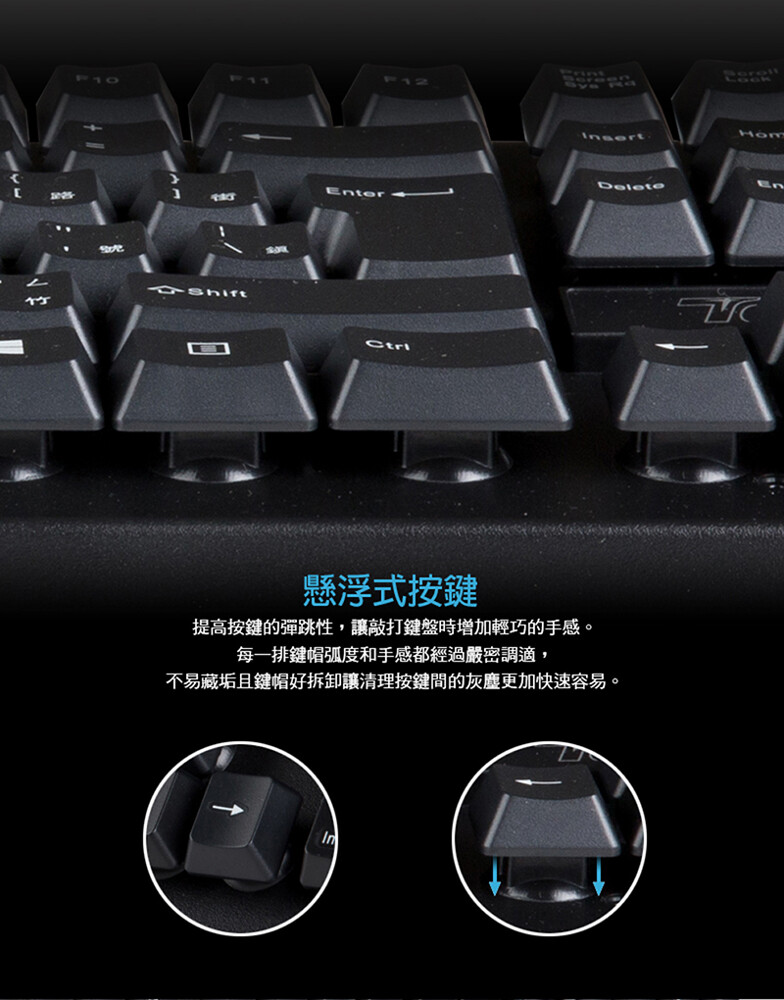 懸浮式按鍵,提供最佳手感 薄膜式按鍵,觸感佳,輕柔低噪音 可調整式腳架,使用舒適及防滑腳墊 鍵帽採用ABS材質按鍵舒適 加大按鍵間隙,提高KEY-IN效率 光學引擎精準定位,四段(800~2400)游標變速 前進/後退多媒體按鍵設計 貼合手型的弧線設計