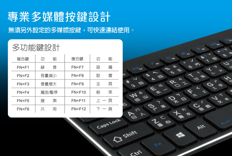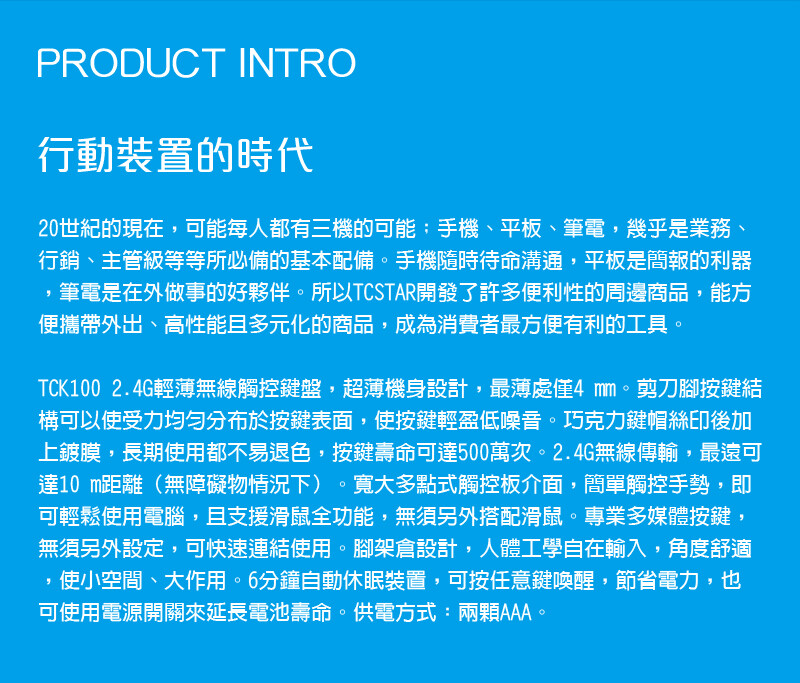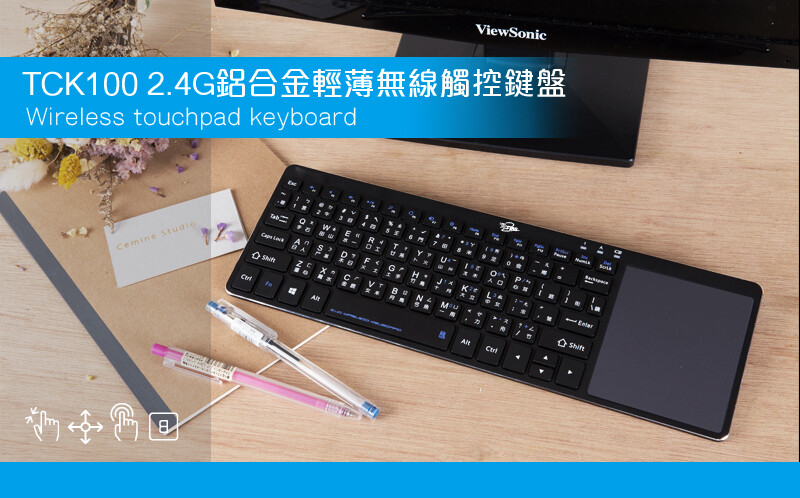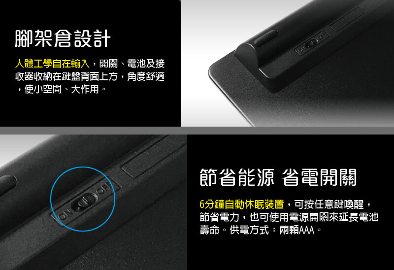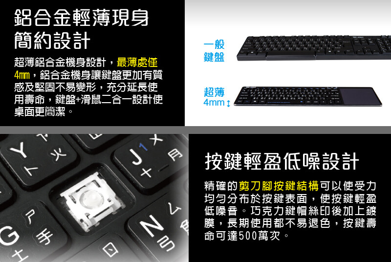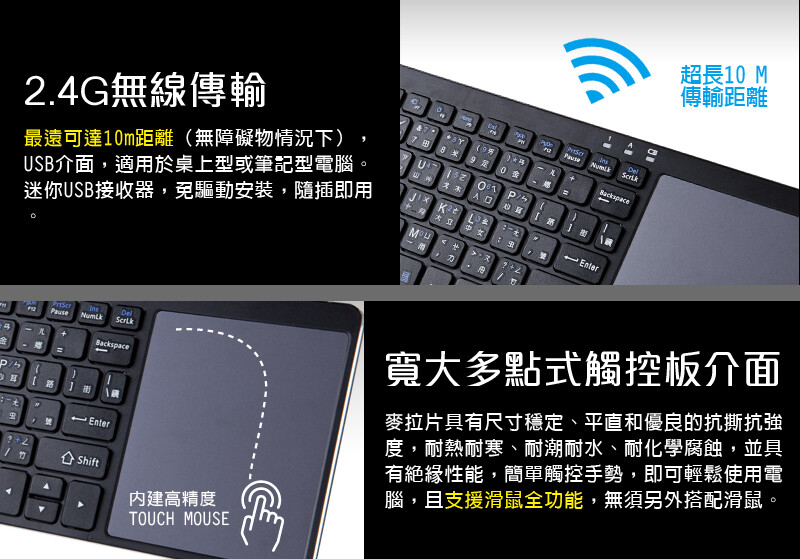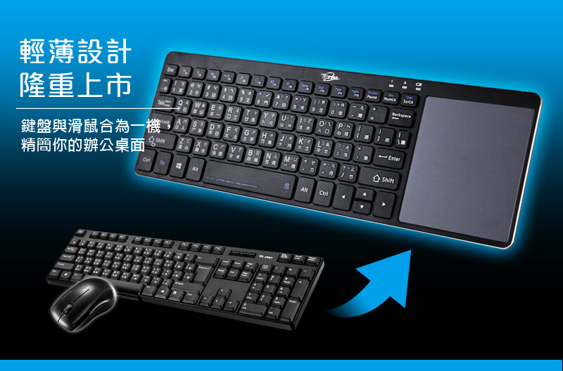 鍵盤與滑鼠合為一機,精簡你的辦公桌面 鋁合金輕薄現身 簡約設計 按鍵輕盈低噪設計 2.4G無線傳輸 寬大多點式觸控板介面 專業多媒體按鍵設計 人體工學自在輸入 6分鐘自動休眠裝置,可按任意鍵喚醒,節省電力