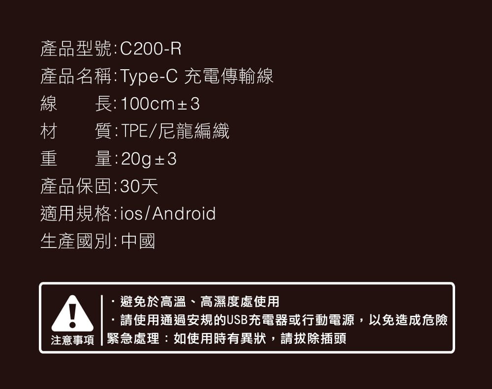 Type-C 雙L頭充電傳輸線 1M (C200-R)