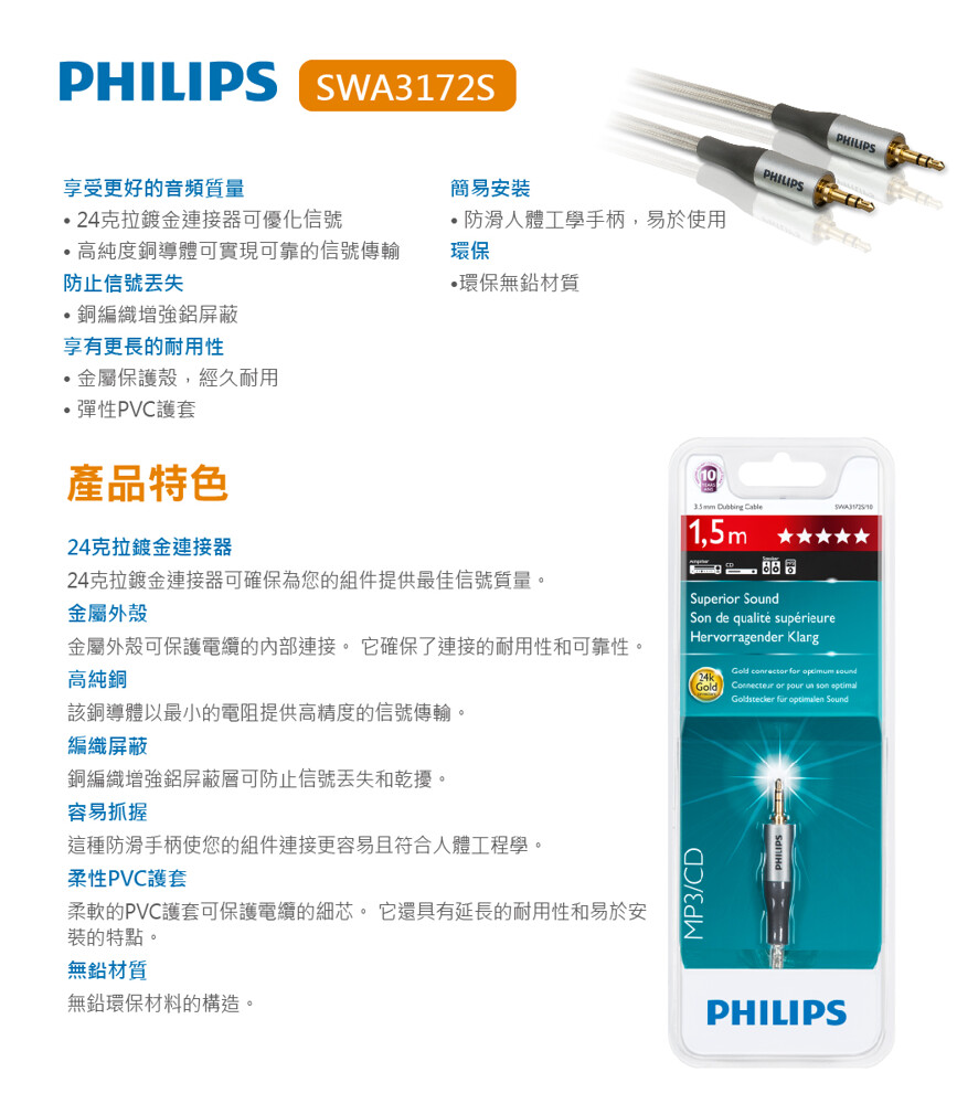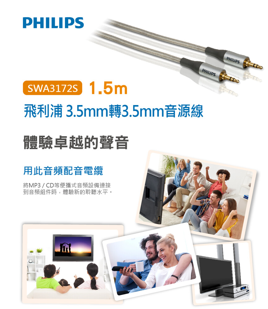 【PHILIPS 飛利浦】 1.5m 3.5mm轉3.5mm音源線 SWA3172S/10