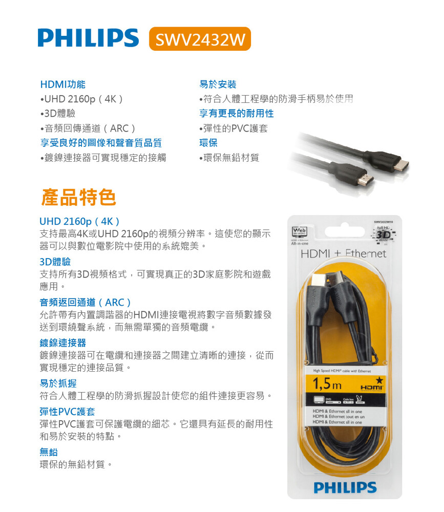 【PHILIPS 飛利浦】 1.5m 高速HDMI 乙太網路傳輸線 SWV2432W/10