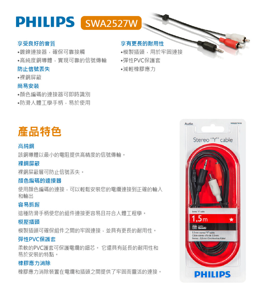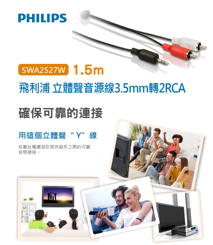 PHILIPS 飛利浦 1.5m 立體聲音源線3.5mm轉2RCA SWA2527W/10