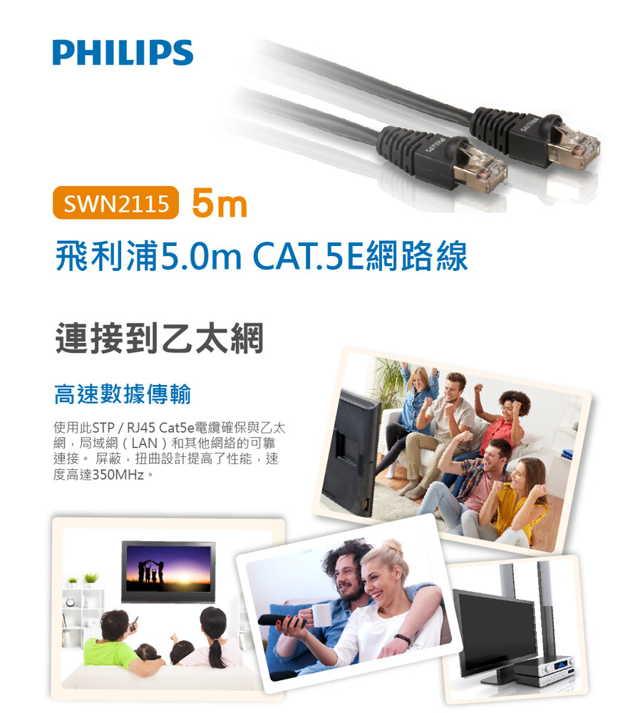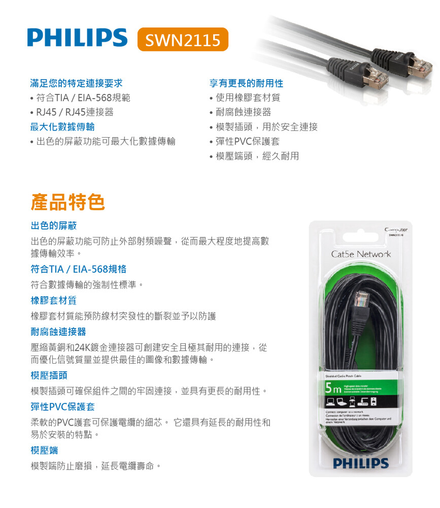 【PHILIPS 飛利浦】 5.0m CAT.5E 網路線 SWN2115/10