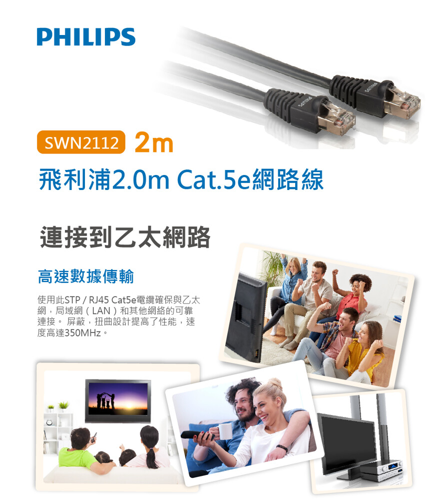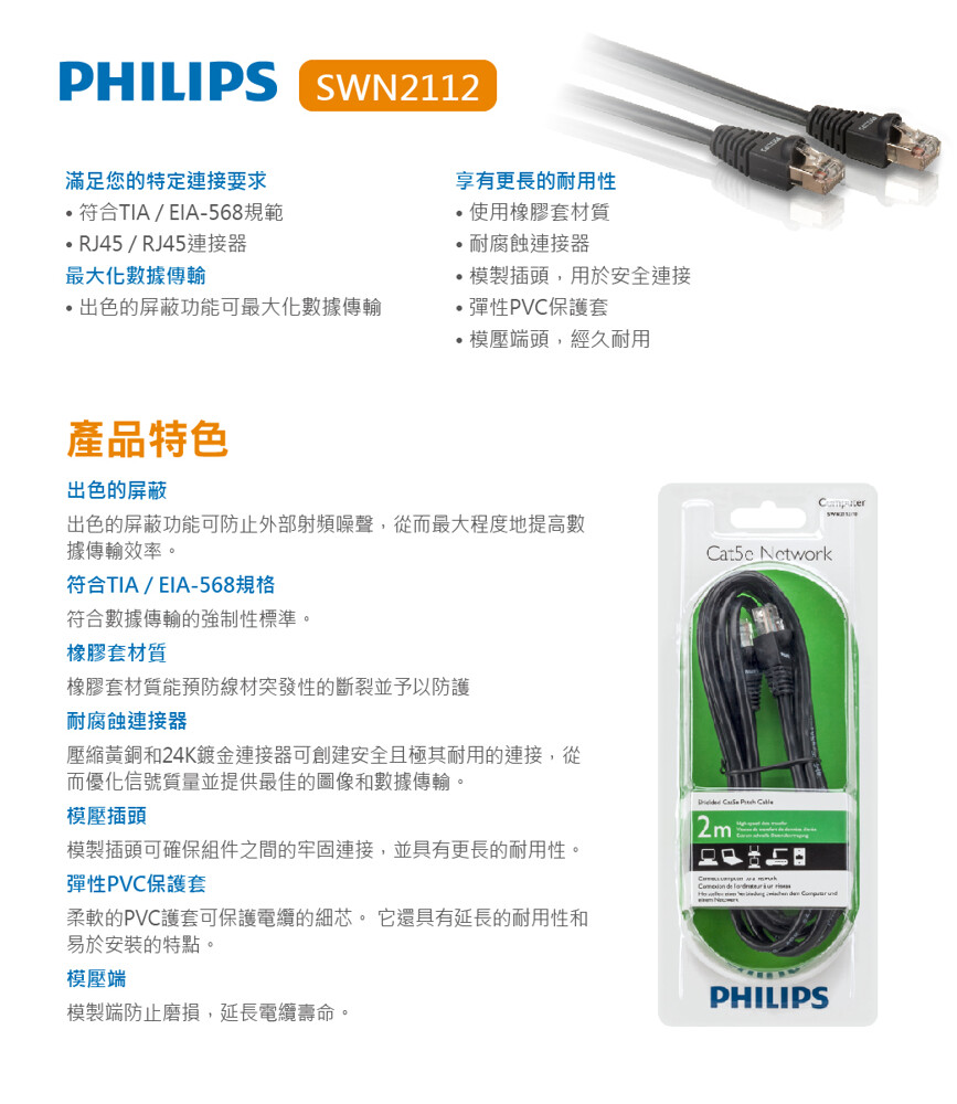 【PHILIPS 飛利浦】 2.0m CAT.5E 網路線 SWN2112/10