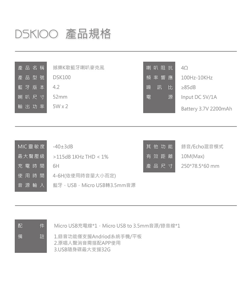 配件 Micro USB充電線*1,Micro USB to 3.5mm音源/錄音線*1