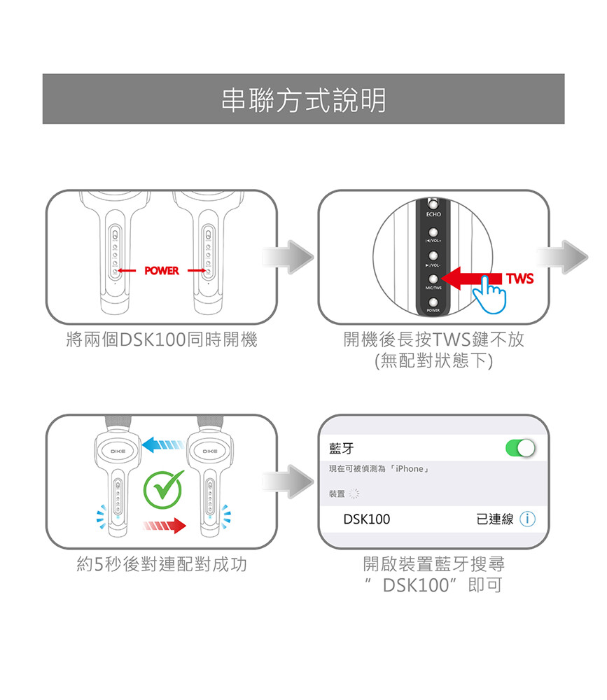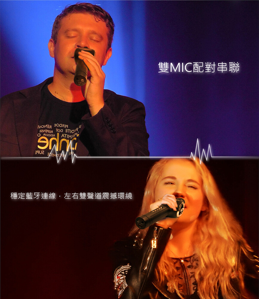 優質藍牙4.2,雙MIC可串聯、同步對唱、分享娛樂