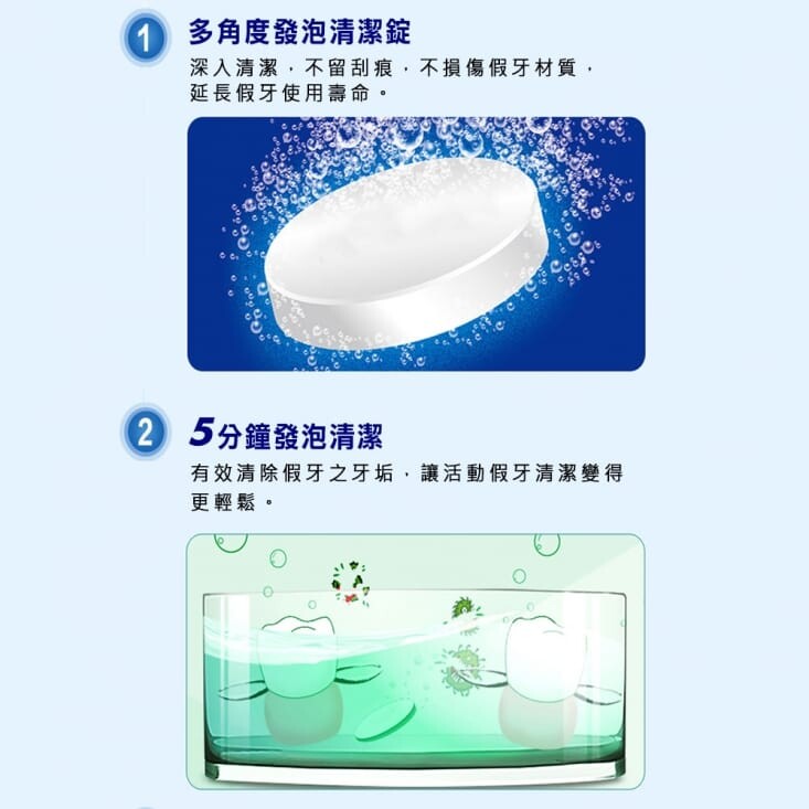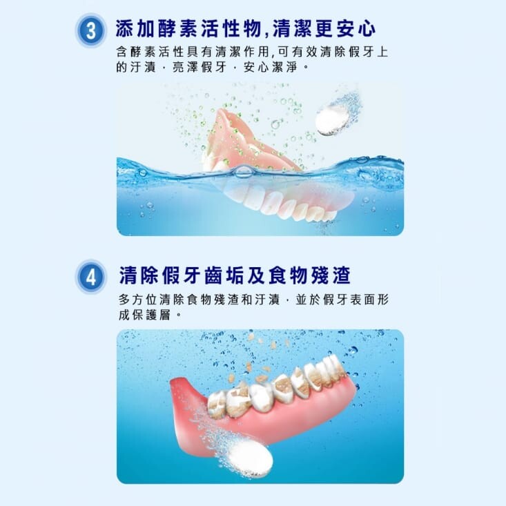 日本KIYOU假牙清潔錠,添加酵素活性物,有效清除汙漬,5分鐘發泡,深入清潔不留刮痕,且不損傷假牙材質,並能達到亮澤、除垢、清新的效果,延長使用壽命。