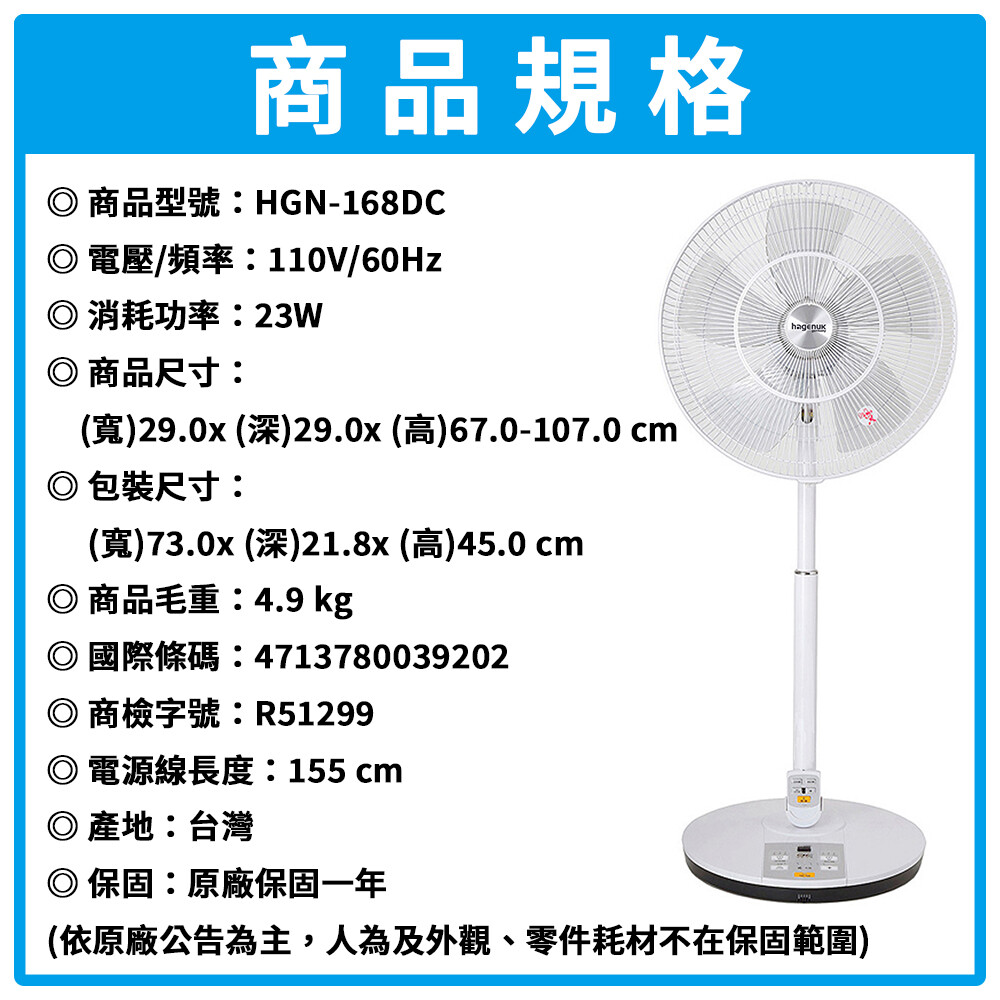 哈根諾克 16吋DC直流遙控電風扇 HGN-168DC