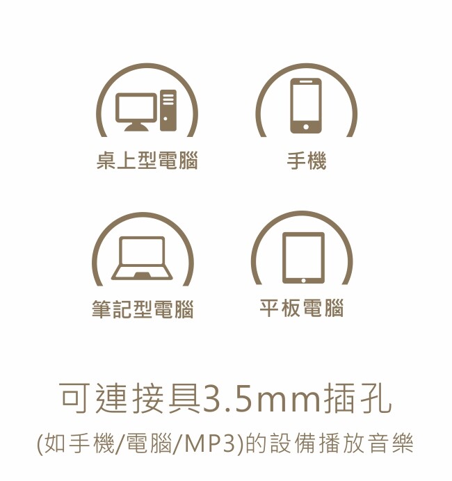 傳輸無障礙.可搭配具藍牙功能的平板電腦/筆記型電腦/智慧型手機也可連接具3.5mm插孔(如手機/電腦/MP3)的設備播放音樂;具USB隨身碟、TF卡槽,插卡直接播放音樂。(支援最高容量32G)