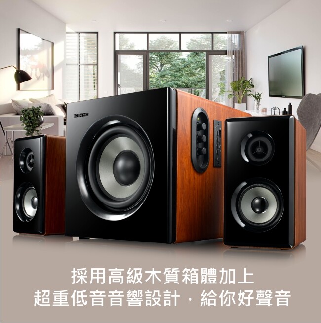 KINYO有20多年喇叭製造經驗,專業製造出P.M.P.O.5000W,大功率輸出,加上木質重低音中央單體,效果加倍、音質混厚,超震撼、超享受!