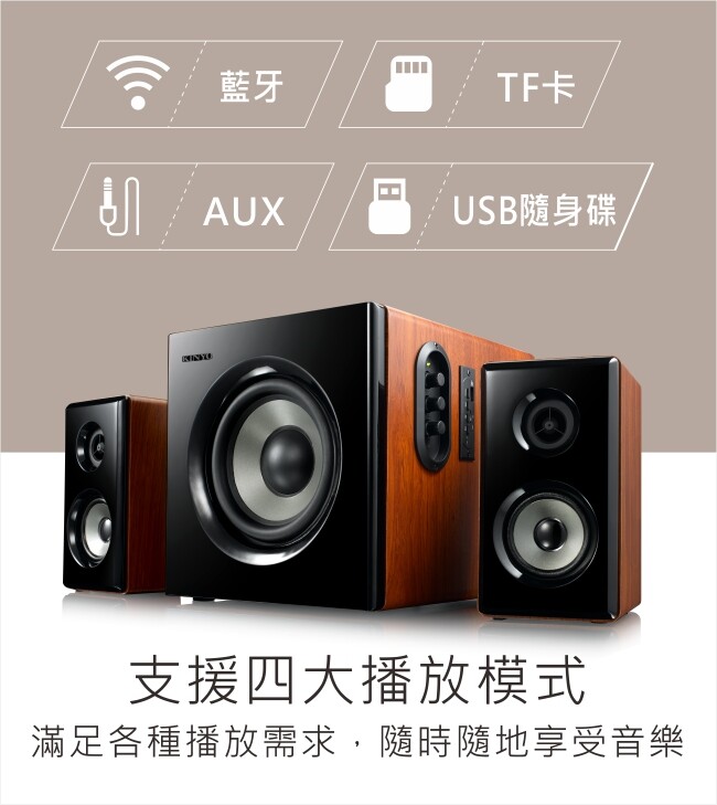 ★好音質:防磁喇叭/音樂不失真 ★好音效:木質音箱/重低音共鳴效果佳 ★好音感:環繞立體音效/現場震撼★ 好方便:無線藍牙/USB、TF卡撥放