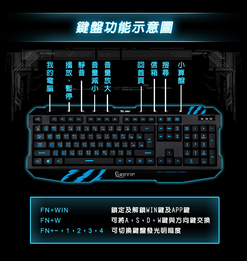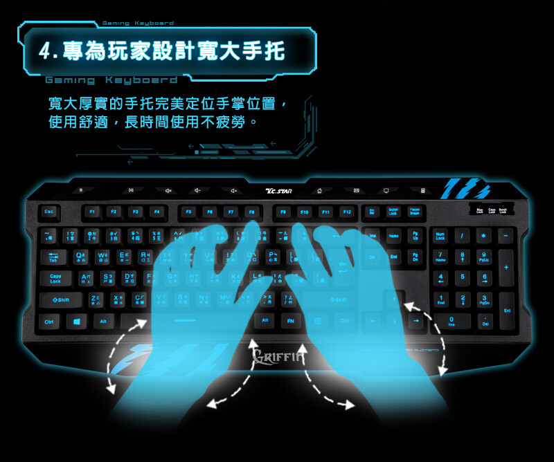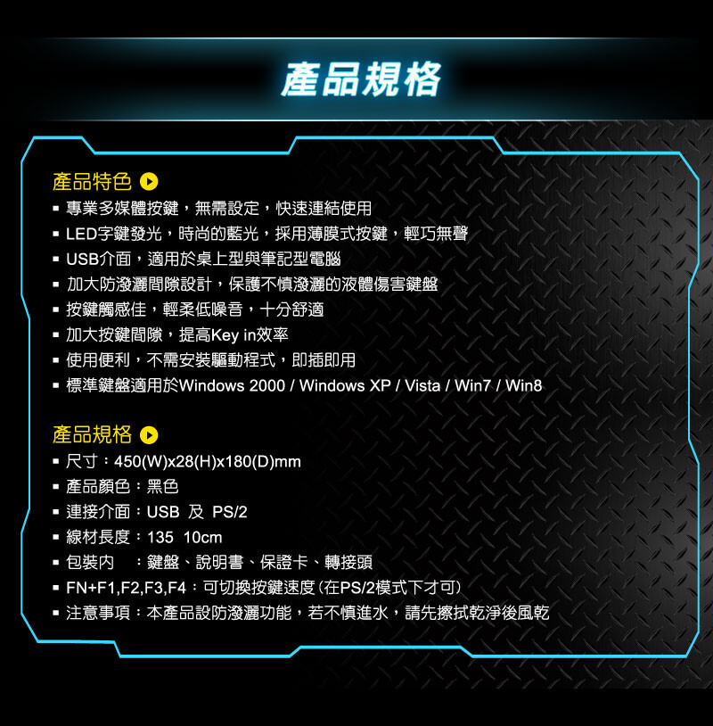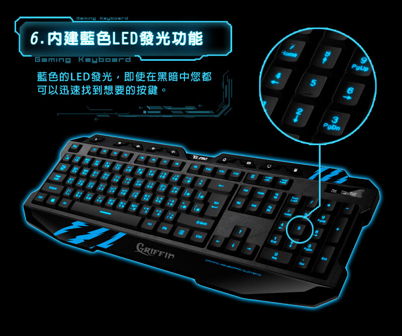 LED字鍵發光,時尚的藍光,採用薄膜式按鍵,輕巧