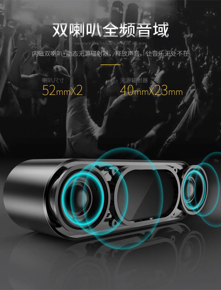 雙喇叭設計,音場飽滿,重低音效果震撼,適合戶外與室內使用。