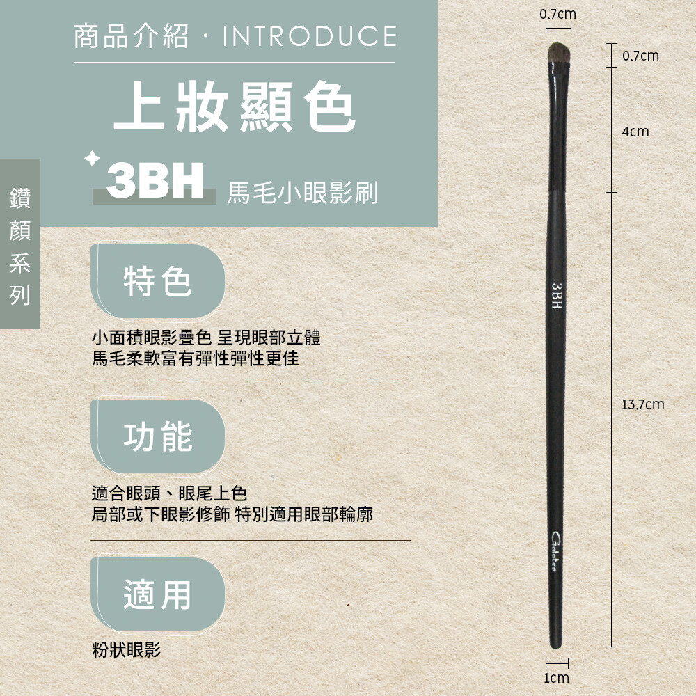 鑽顏系列3BH馬毛小眼影刷,馬毛柔軟富有彈性,沾取粉狀或霜狀的眼影,能均勻上色,適用於重點式開眼頭、局部或下眼影修飾。勾劃明亮出色雙眸。最適合粉領新貴、學生愛美族、敗犬女王、彩型師、美容考照學生、新娘秘書、彩妝造型要求度高的美女們......