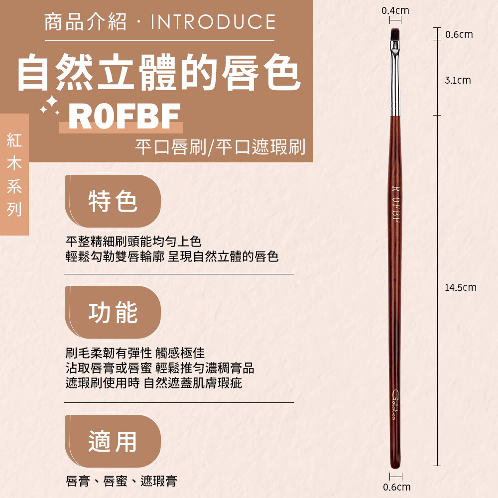平整精細刷頭能均勻上色 輕鬆勾勒雙唇輪廓 呈現自然立體的唇色 品牌:GALATEA葛拉蒂 商品名稱:紅木系列 平口唇刷/平口遮瑕刷R0FBF 適用部位:唇部 規格:總長18.2cm 重量3g主要材質:纖維毛 手柄材質:天然紅實木柄 產地:中國