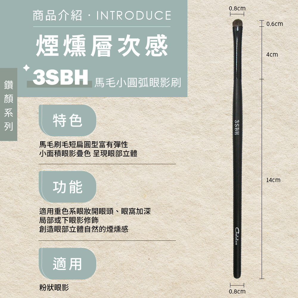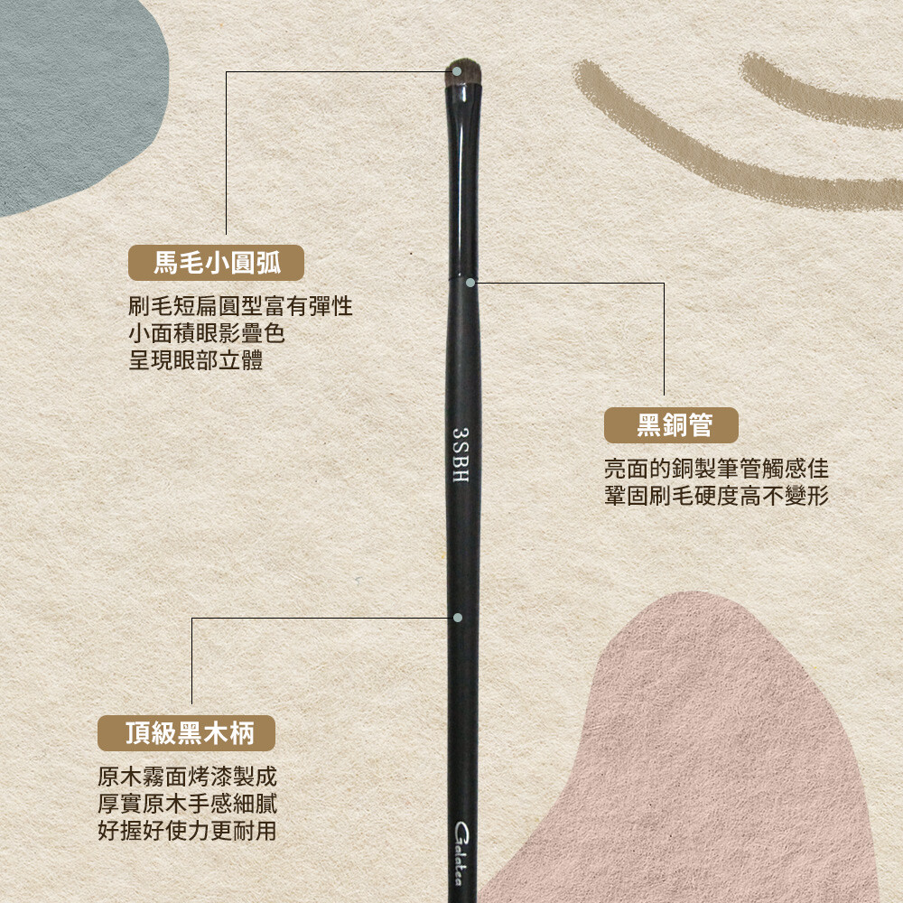 鑽顏系列3SBH馬毛小圓弧眼影刷,刷毛短扁圓型富有彈性,沾取粉狀或霜狀的眼影,上色均勻飽滿。適用於重色系眼妝的表現。做重妝開眼頭、眼窩加深、局部或下眼影修飾,創造眼部立體自然的煙燻感。最適合粉領新貴、學生愛美族、敗犬女王、彩型師、美容考照學生、新娘秘書、彩妝造型要求度高的美女們......