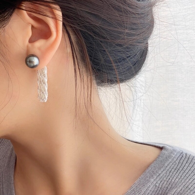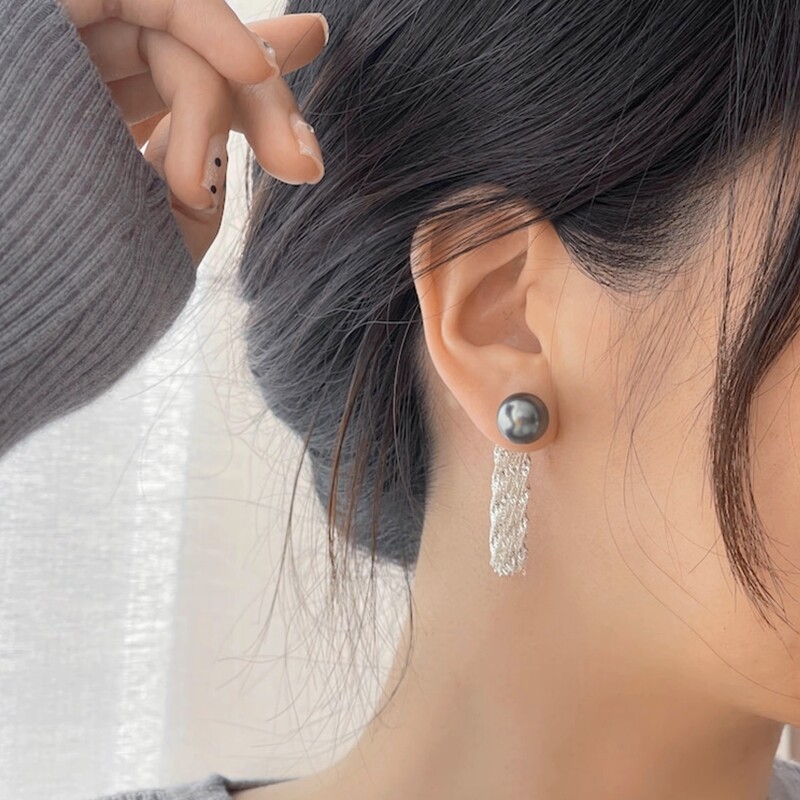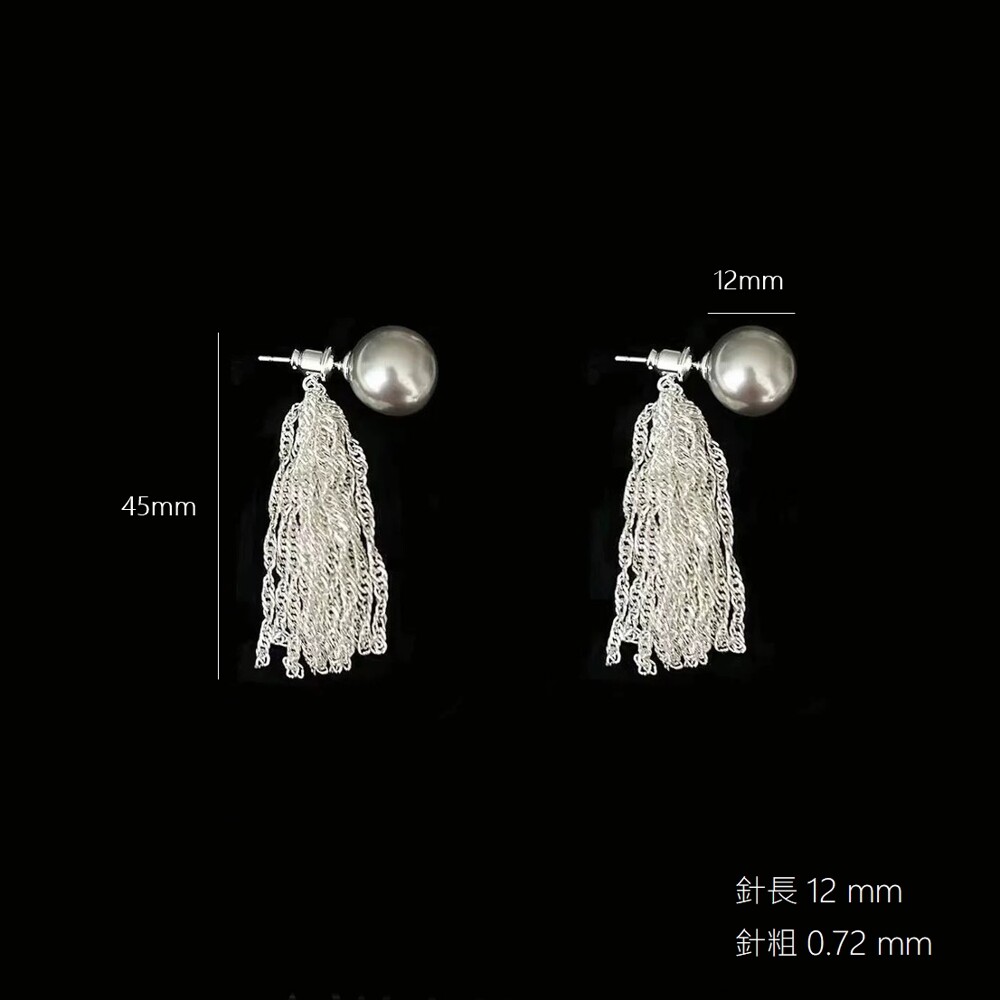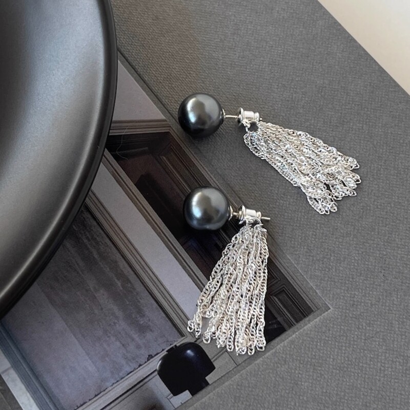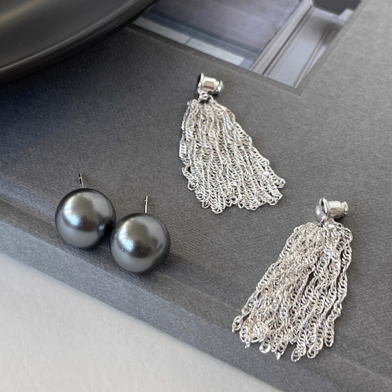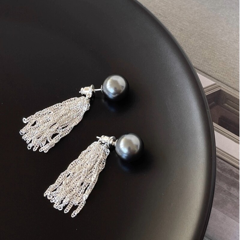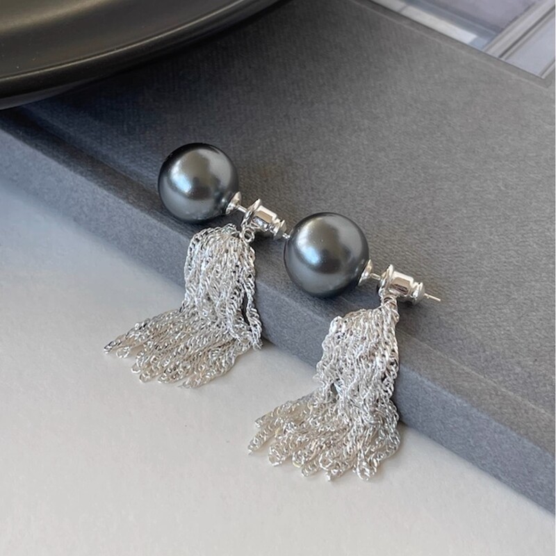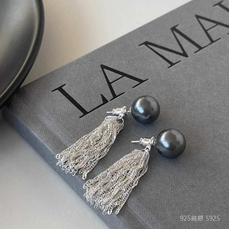 灰黑珍珠 長款流蘇後勾耳釘 獨特唯一