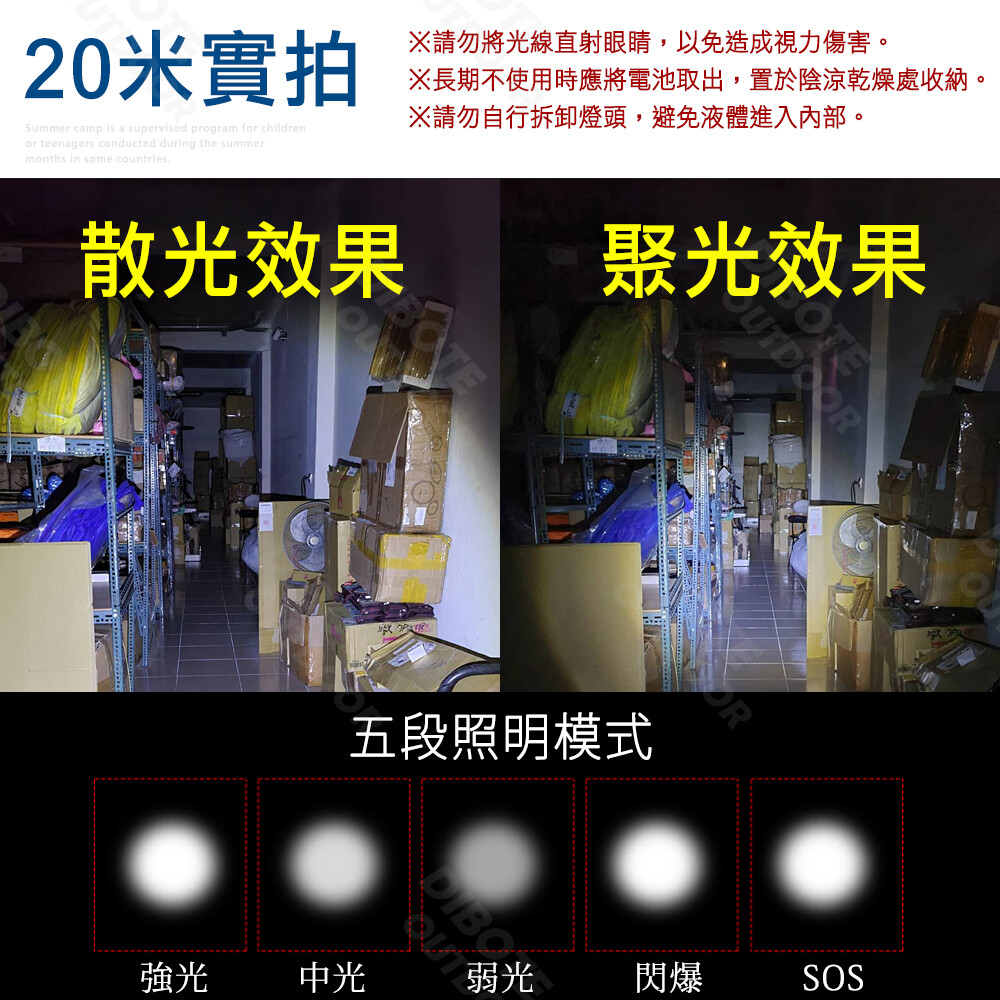 ◆五段照明模式,強光、中光、弱光、爆閃、SOS