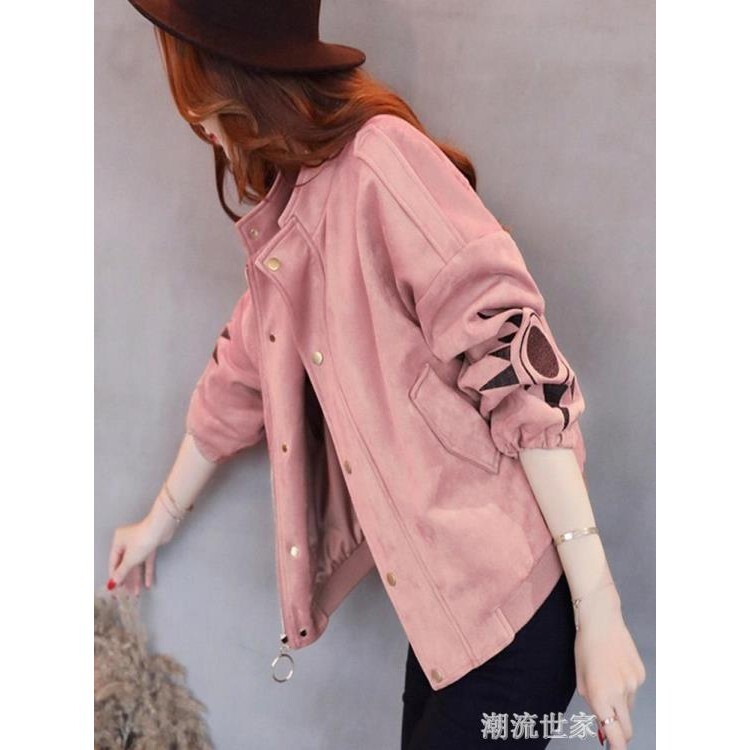 鹿皮絨外套女春秋新款韓版復古港味粉色刺繡短款棒球服外衣潮