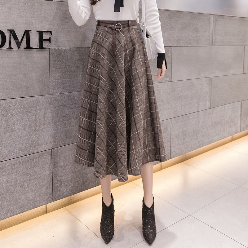 復古格子長裙毛呢半身裙女秋冬中長款a字裙遮胯裙子顯瘦高腰傘裙1入