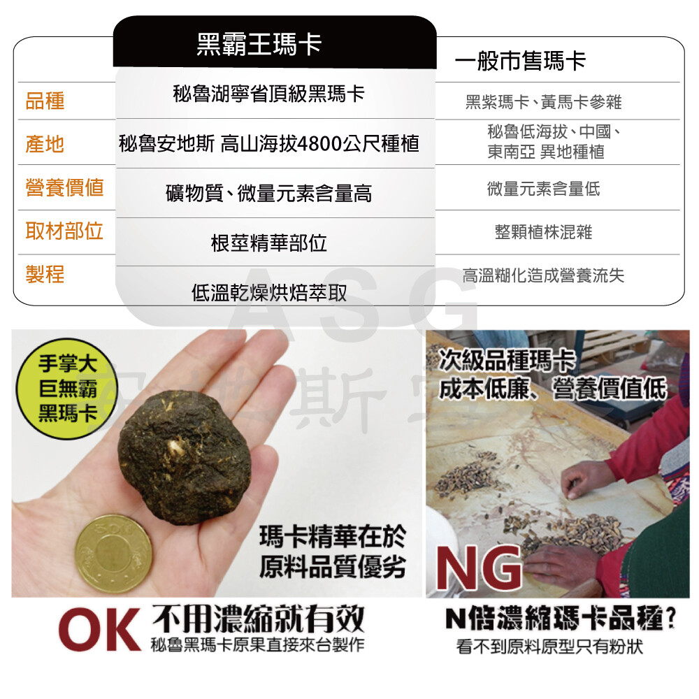 採用秘魯純黑瑪卡XL SIZE「黑鑽石」,產於秘魯湖寧省海拔4800公尺的安地斯山脈、無毒野放種植、天然日曬,人工採收,採收後即休耕7年,黑色占總產量5~10%,故極珍貴稀有,只取根莖精華部位,經低溫乾燥烘焙與超音波水萃技術,完整保留活性成分,含豐富的礦物質和微量元素,增強體力,精神旺盛,滋補強身。