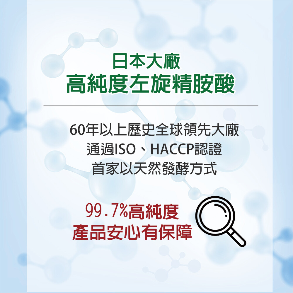 60年以上歷史,全球領先大廠,通過ISO、HACCP認證,首家以天然發酵方式,並生產99.7% 高純度左旋精胺酸。