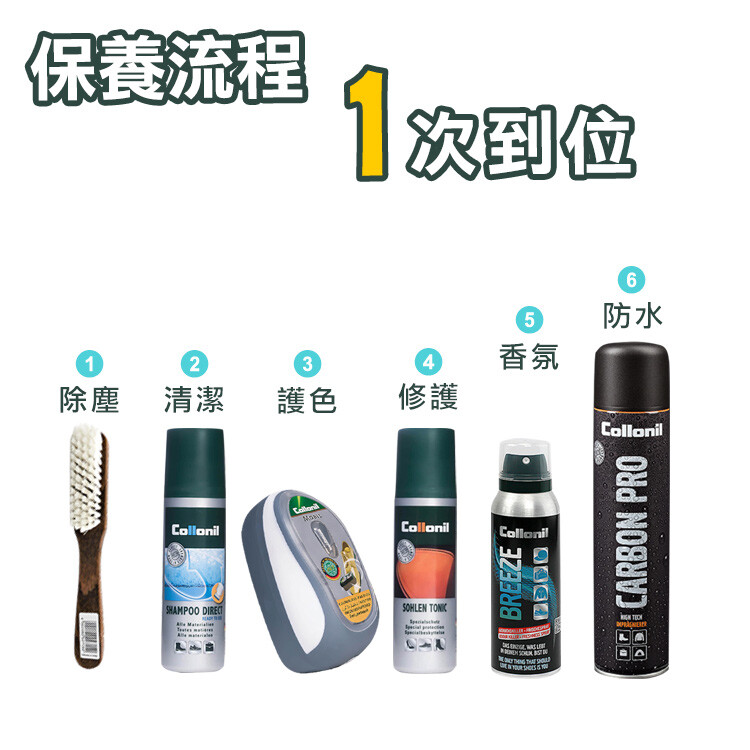 內容物:6入,紡織皮革清潔劑+鞋底保養劑+除塵刷+多功能清新噴霧+防水噴霧+行動鞋油