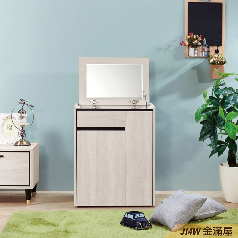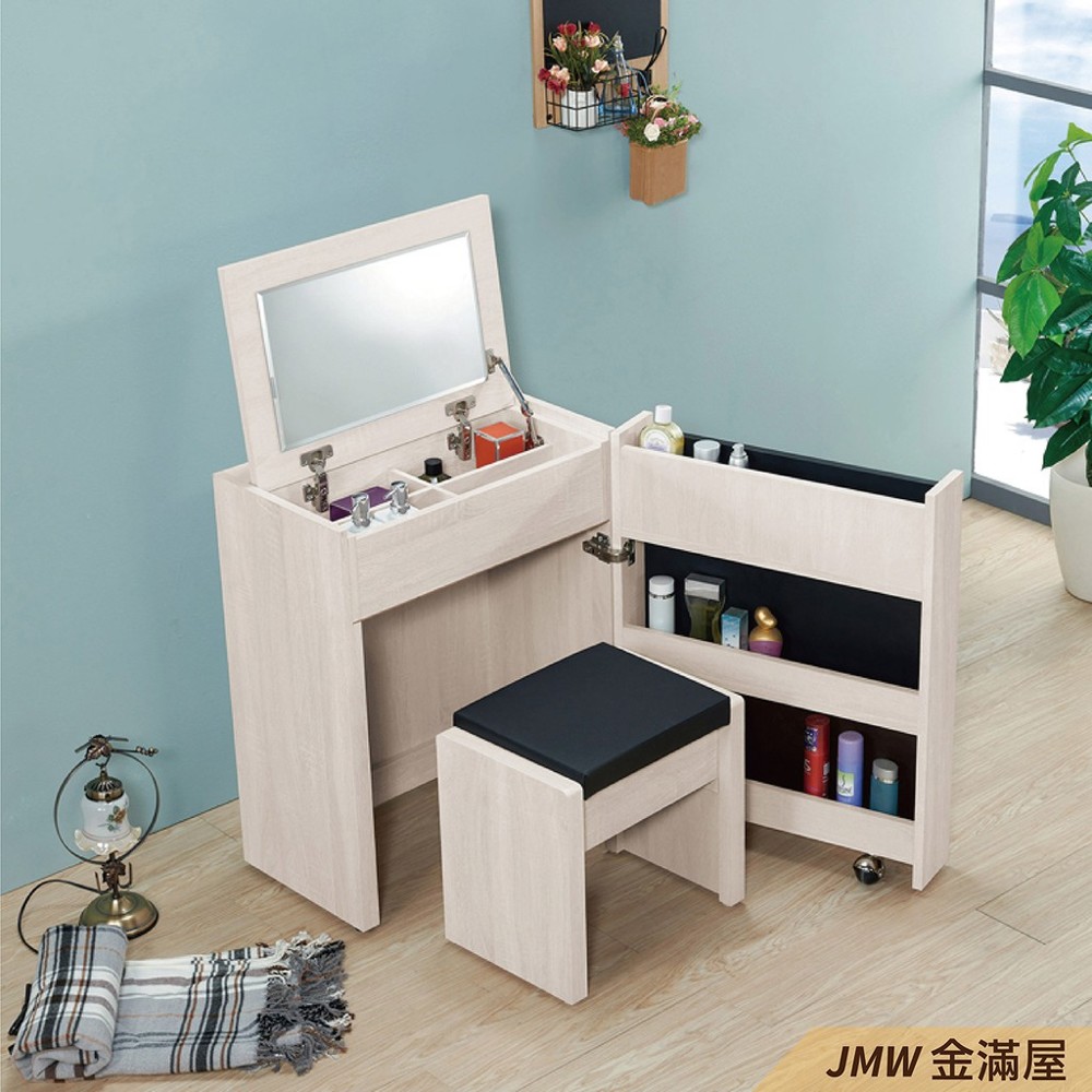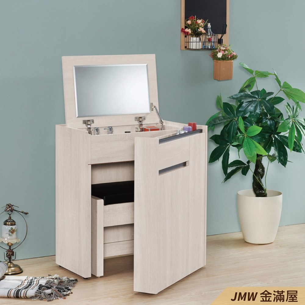 材質:1.木心板材質採用 mit 防蛀環保低甲醛 a 級木心板 2.表面為專利技術木紋同調立體浮雕處理比擬鋼刷實木視覺觸感 3.採用 mit 鋼珠滑軌 抽屜牆板採用高級木皮夾板 (不易受潮變質) 4.採釘附式美背處理 5.化妝椅皮墊採用高級耐磨透氣皮 6.採用高級油壓緩衝鉸鍊