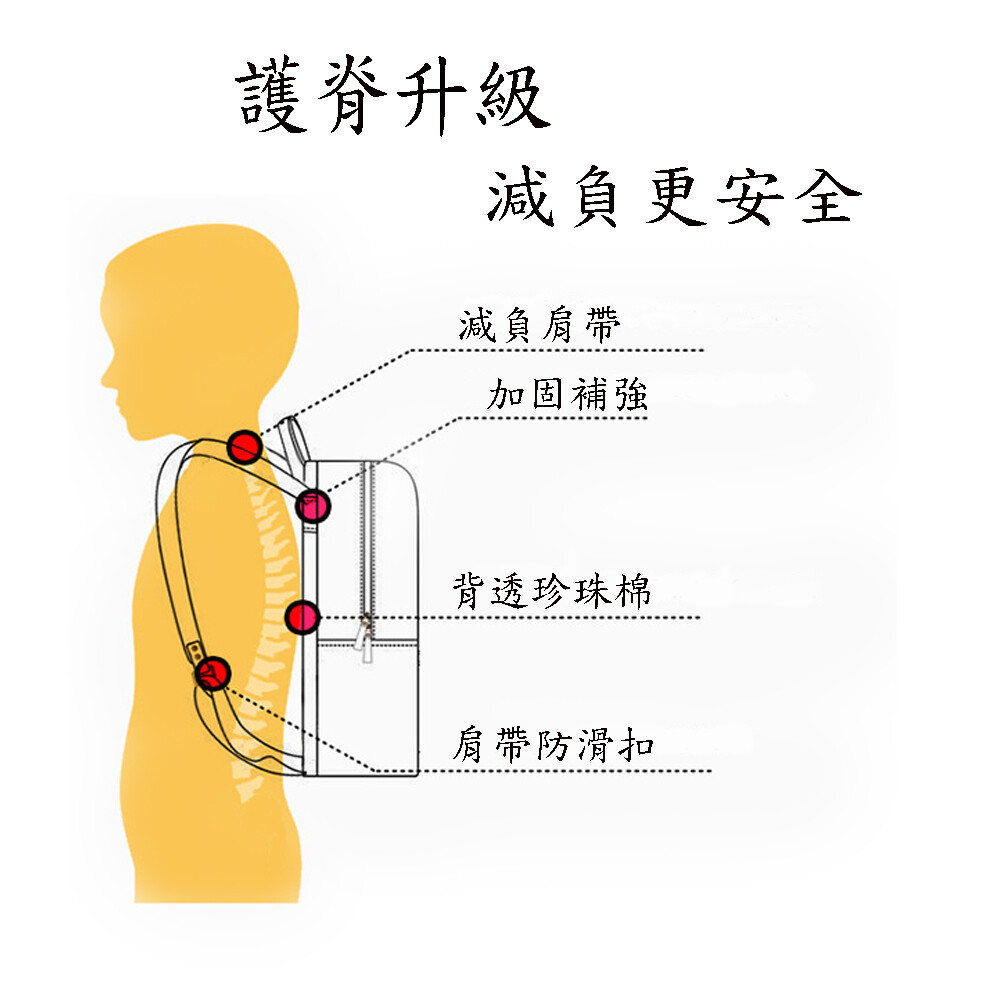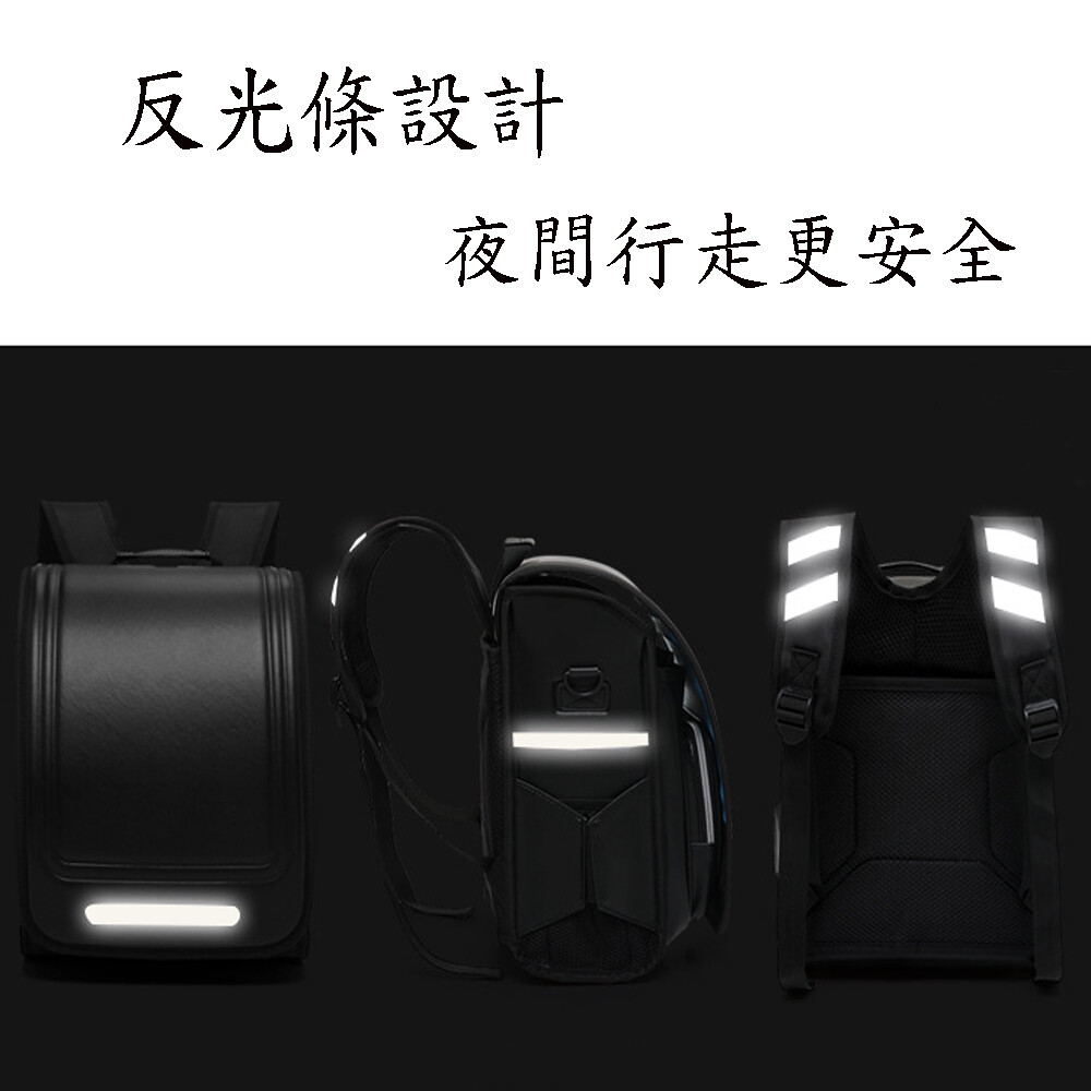 日系減壓護脊兒童書包,可有效分擔小孩還未成熟脊椎的壓力。硬挺質料,背上書包等於強制矯正孩子駝背的壞習慣。背後附加反光側條,早上、傍晚行走更安全。